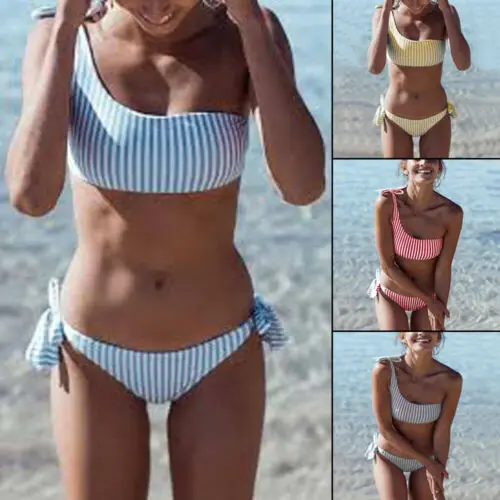 2019 женский полосатый бандажный комплект бикини с пуш-ап и подкладкой на одно плечо, купальник, купальный костюм, танкини, пляжная одежда