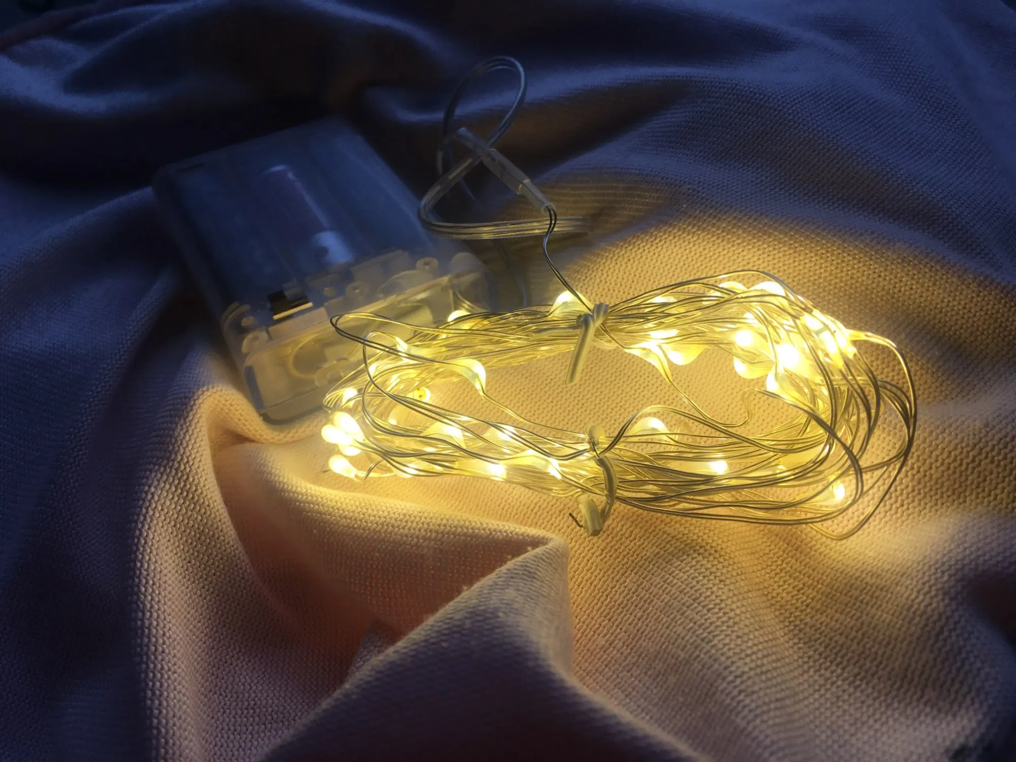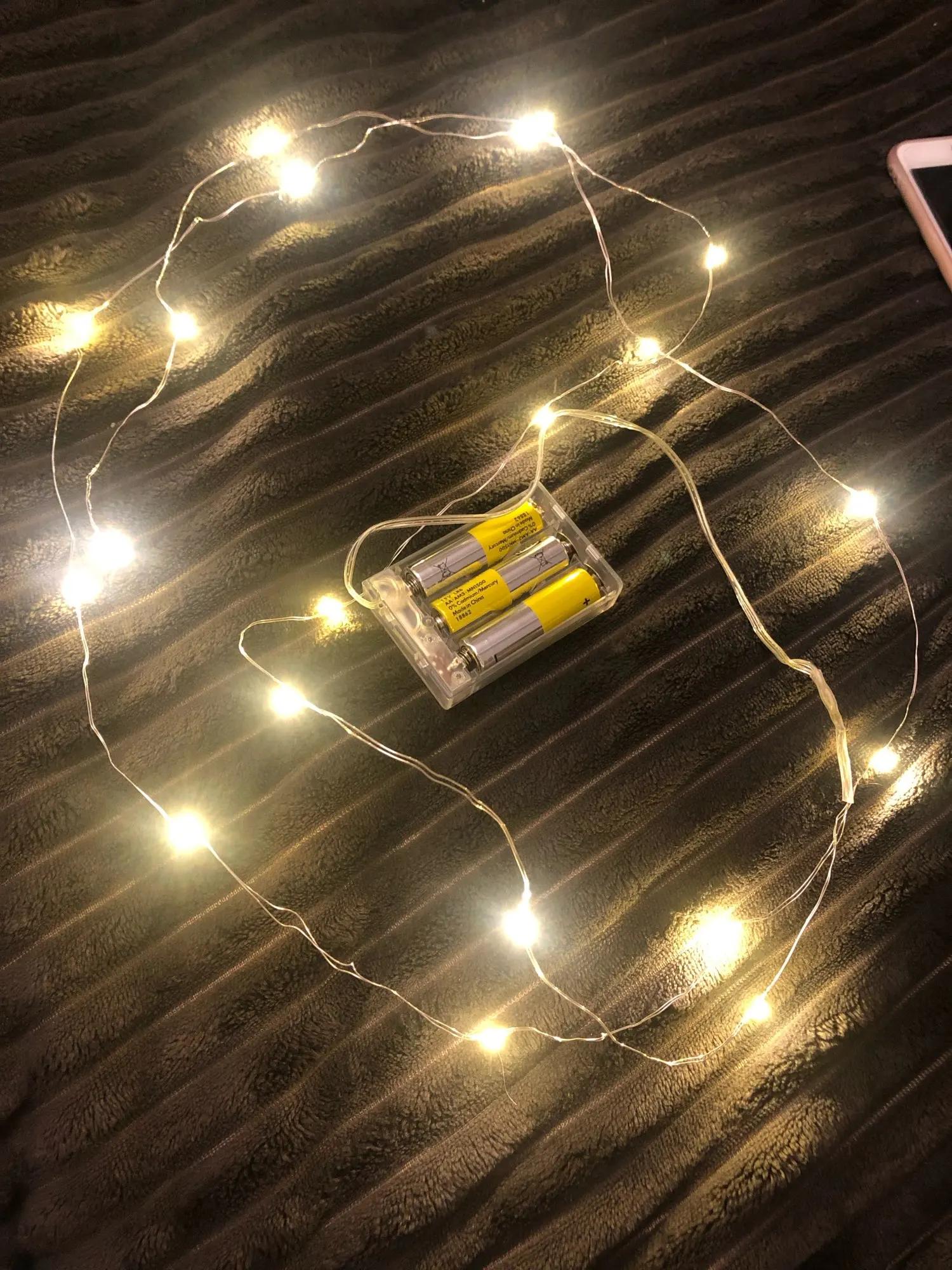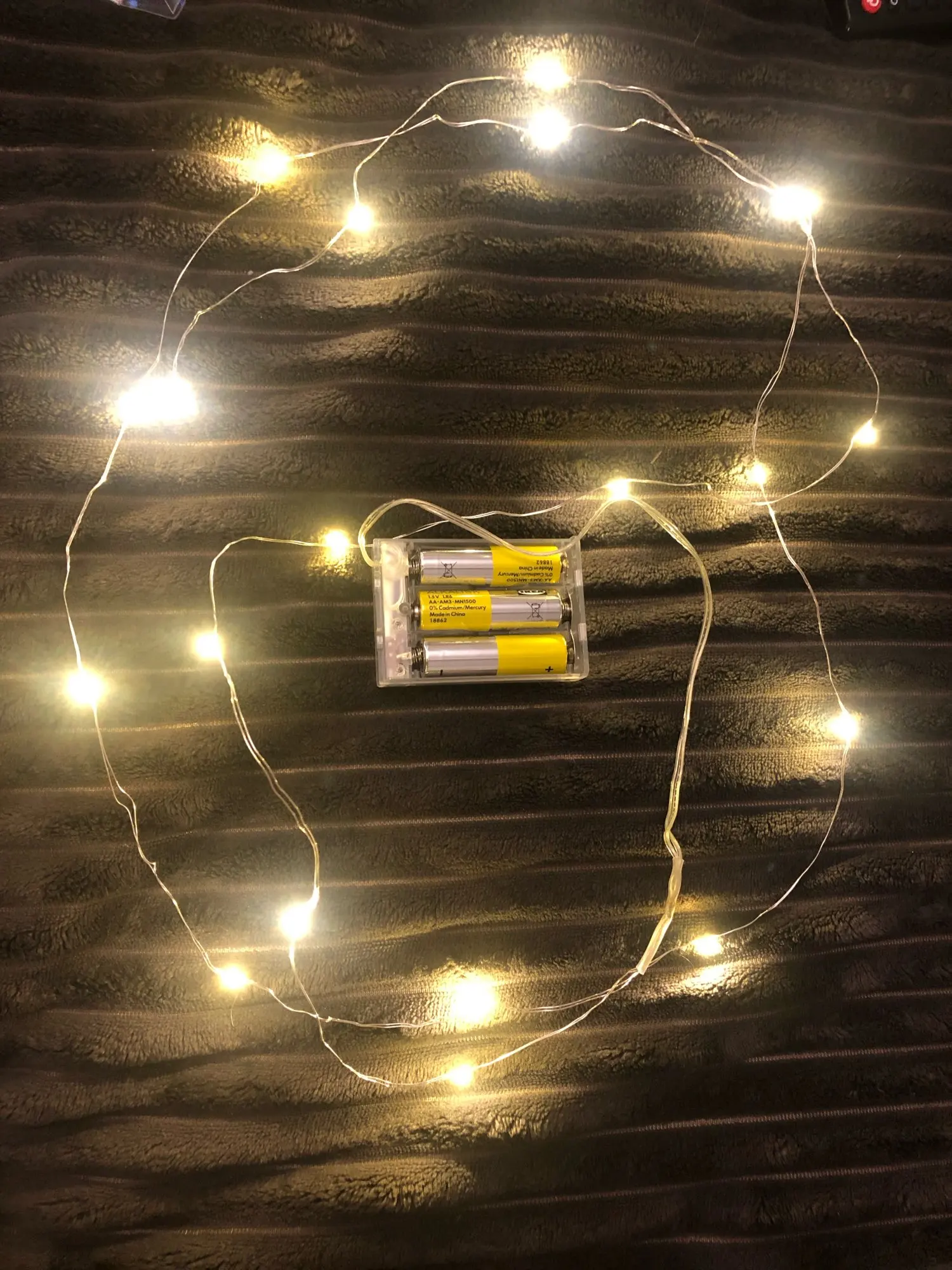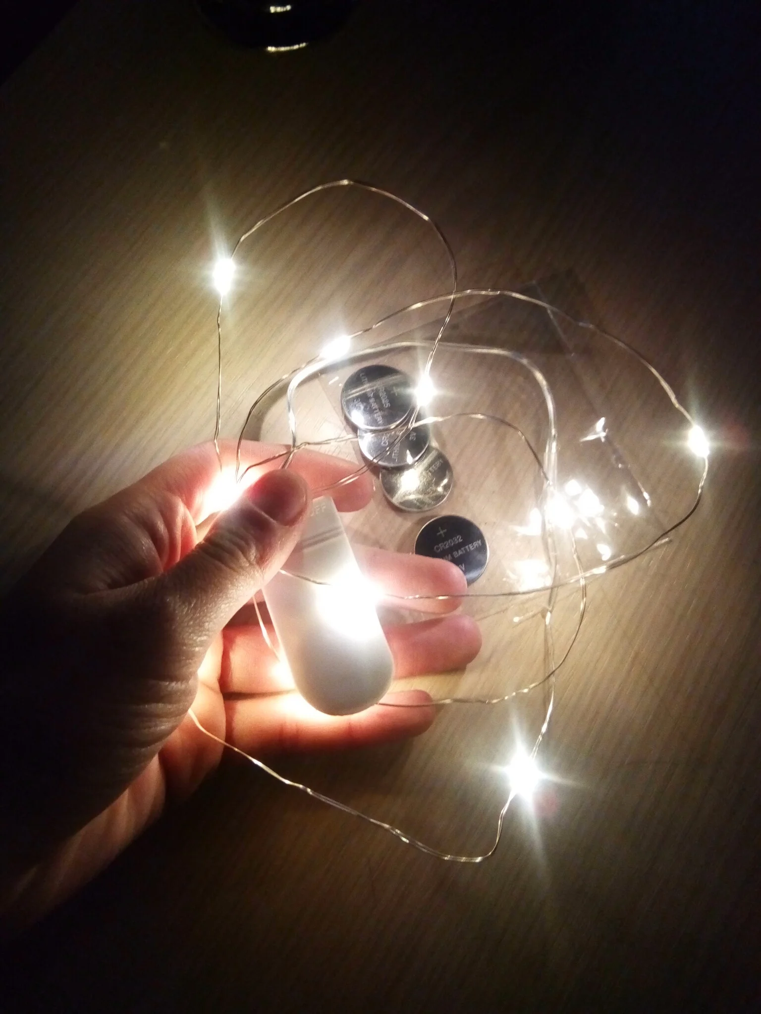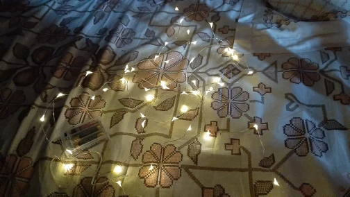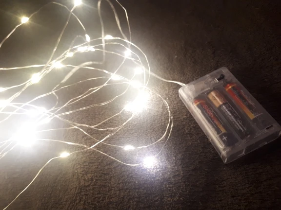 Хорошая гирлянда. Взяла 2 метра на круглых батарейках cr2032 (нужно 2 шт). Света достаточно, чтобы проведать ребенка и не искать его в потёмках, но при этом не тревожить сон. Доставка заняла пару недель.