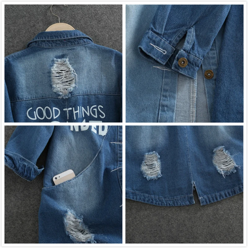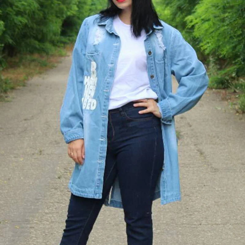 Женская джинсовая куртка, длинная Повседневная куртка большого размера с дырками и надписями, осенняя ветровка, размера плюс, 9XL