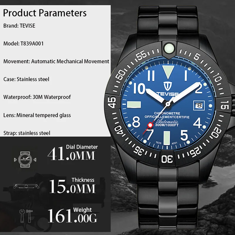Особенности:Автоматический механический механизм, Батарея не нужна.Браслет из нержавеющей стали долговечен и удобен в носке.Отображение времени, качественные и классические мужские часы.Водонепроницаемость(3 атм): Ежедневная Водонепроницаемость (не для душа и плавания).Идеально подходит для многих случаев. Это хороший партнер в вашей жизни! Функции: время, календарь дисплей и светящиеся стрелки. Характеристики:Бренд: TEVISEТип движения: механическийЦвет: серебристый/золотистый/синий/черный/белыйФорма циферблата: круглаяМатериал корпуса: металлМатериал браслета: нержавеющая стальМатериал зеркала: минеральное стеклоТип застежки: ПряжкаПол: мужчиныСтиль: деловой и модныйУровень водонепроницаемости: 3 АТМДиаметр циферблата: 4,1 смТолщина циферблата: 1,5 смШирина ремешка: 2,2 смДлина ремешка: 22 смВес часов: 161 гПосылка: 16*6*4 см/6,30*2,36*1,57 дюймаВес посылка: 166 г