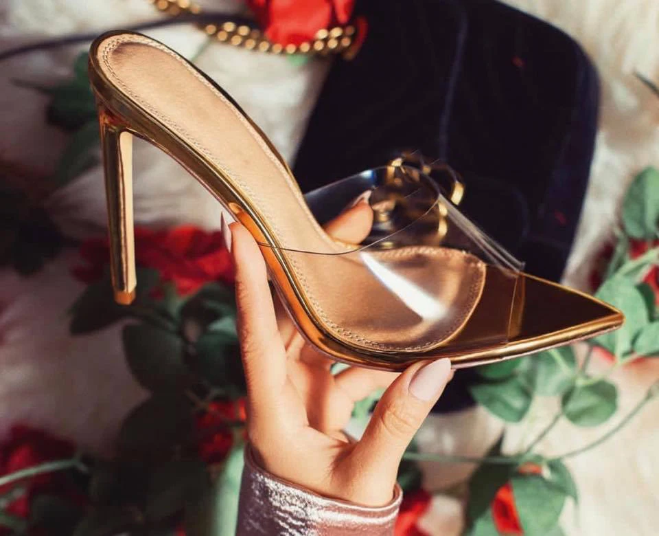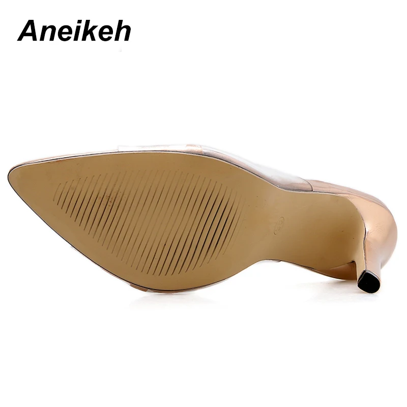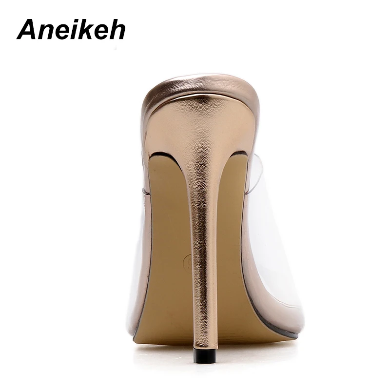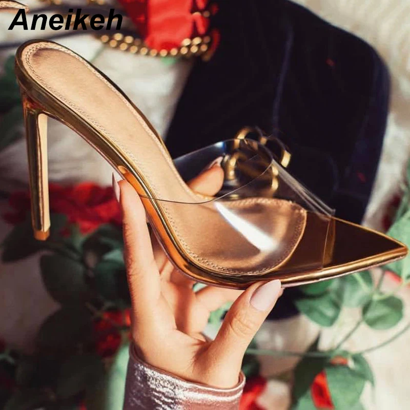 Классические летние тапочки Aneikeh из ПВХ на высоком каблуке, 2022, пикантные прозрачные туфли с открытым носком на тонком высоком каблуке, однотонные с острым носком, золотистого цвета, размеры 35-40