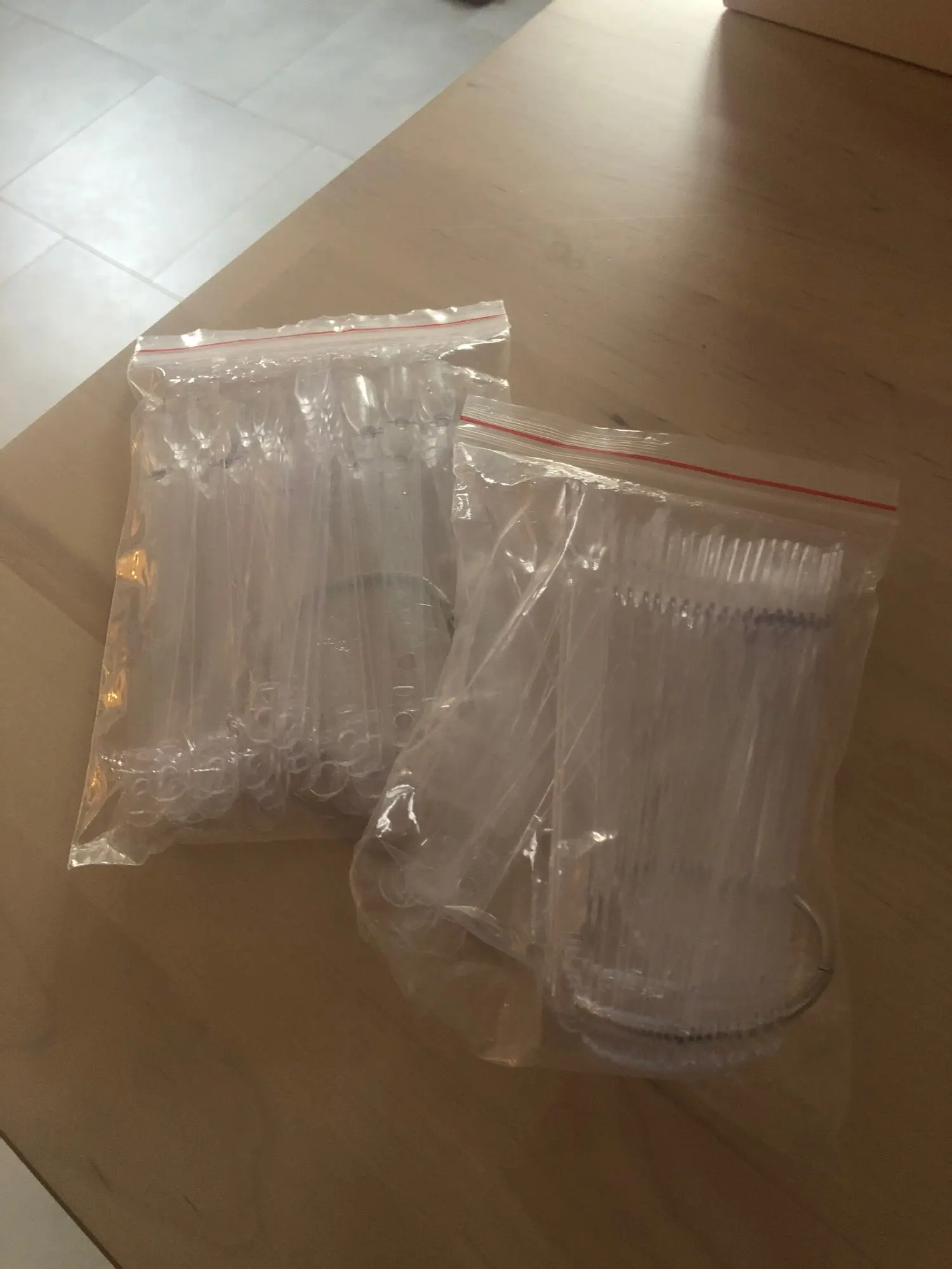 Только один из наконечников сломан. Продукт был упакован в полиэтиленовый пакет, а затем в пузырчатую пленку. Необходимо собрать кончики на кольце. Металлическое кольцо на ощупь прочное и не свободное. Чтобы наклеить этикетку, я наложил маскировочную ленту сверху, а затем напечатал более крутой.