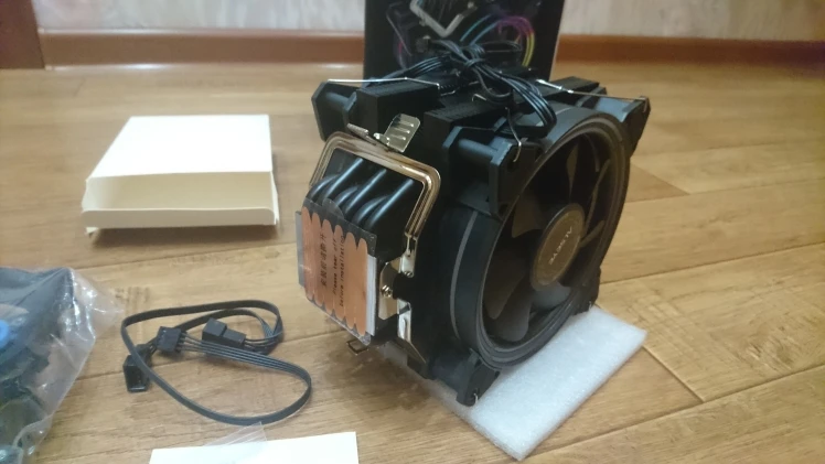 Доставка из Китая до Нижнего Новгорода 9 дней. Упаковано надёжно, коробка была завернута в 5 слоев пупырки. Куллер без повреждений. В комплекте 2 типа крепления, переходник с 2 4-pin на 1, пакетик с термопастой. Не шумит, светится хорошо. охлаждает хорошо.