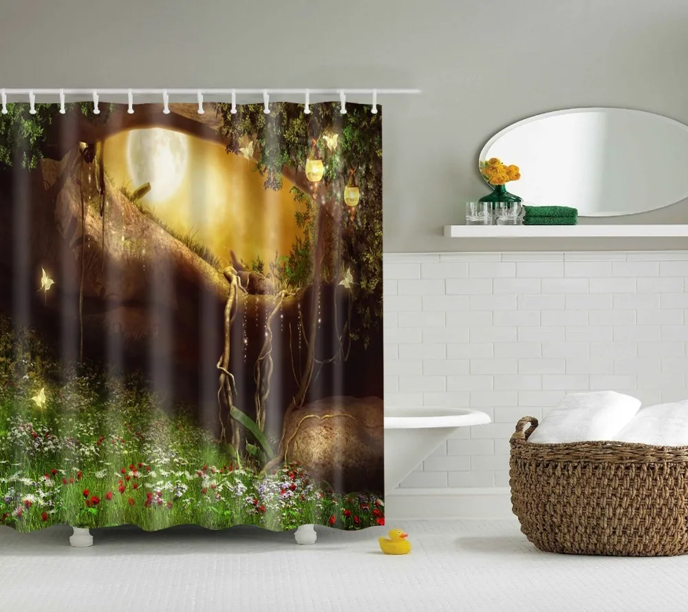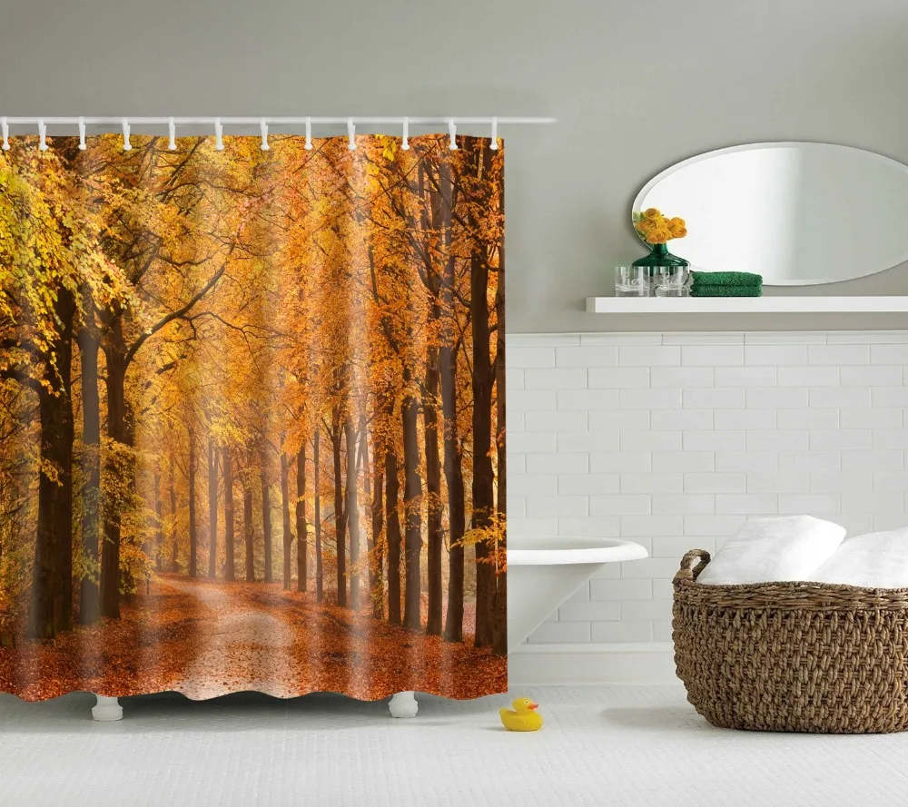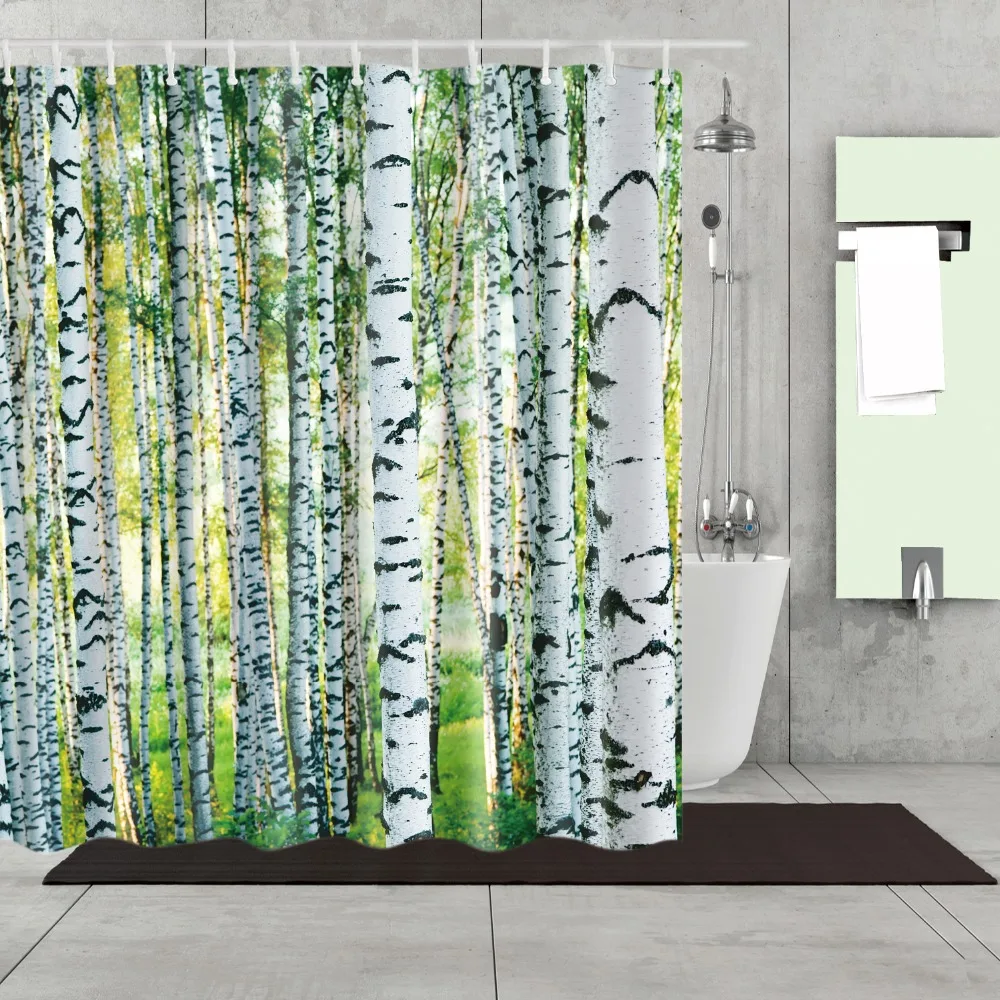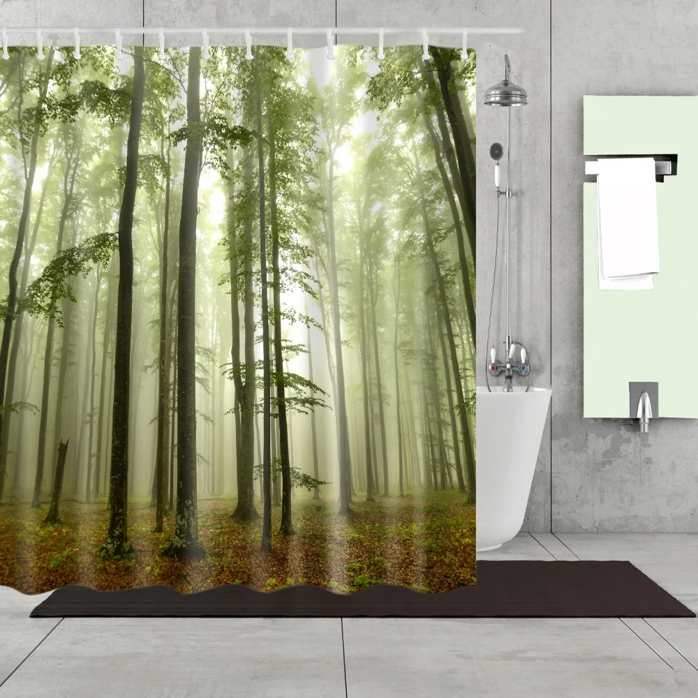 Занавеска для душа из полиэстера, водонепроницаемая, с 3D-принтом леса и деревьев, с крючками