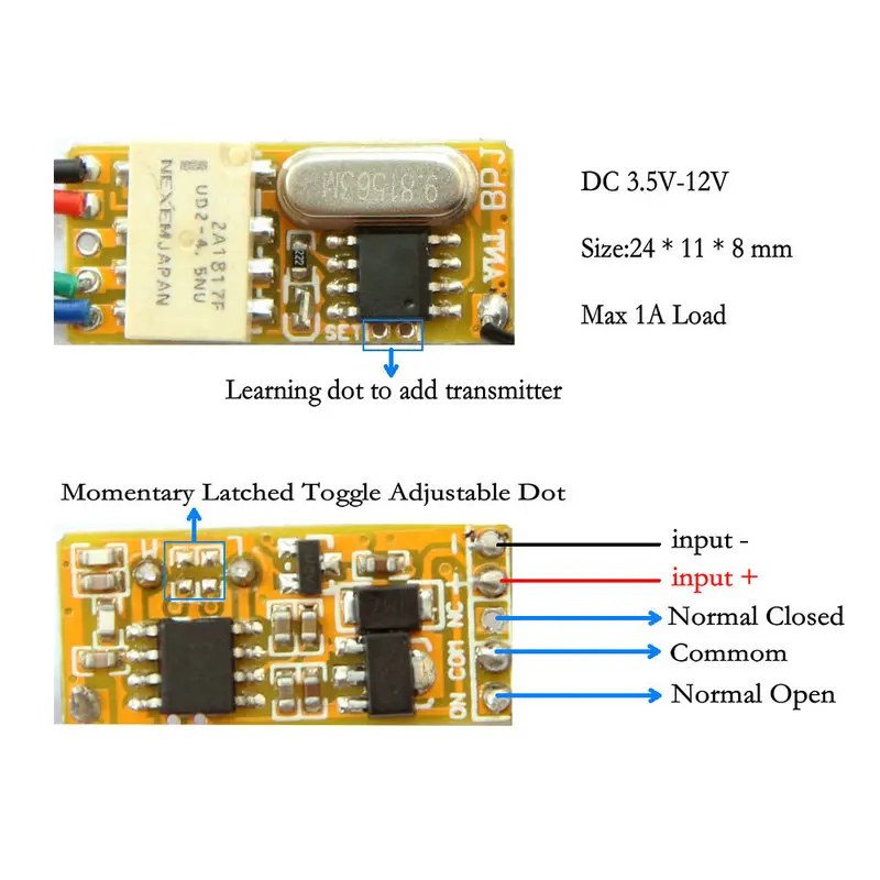 Вход 3,5 V-12V для приемника, подключите обучающая точка, приемник светодиодный индикатор включения. Нажмите кнопку дистанционного управления 1 раз, светодиодный индикатор мигает 3 раза, затем нажмите кнопку дистанционного управления B 1 раз, светодиодный индикатор мигает 3 раза снова, это означает, что обучение успешно.