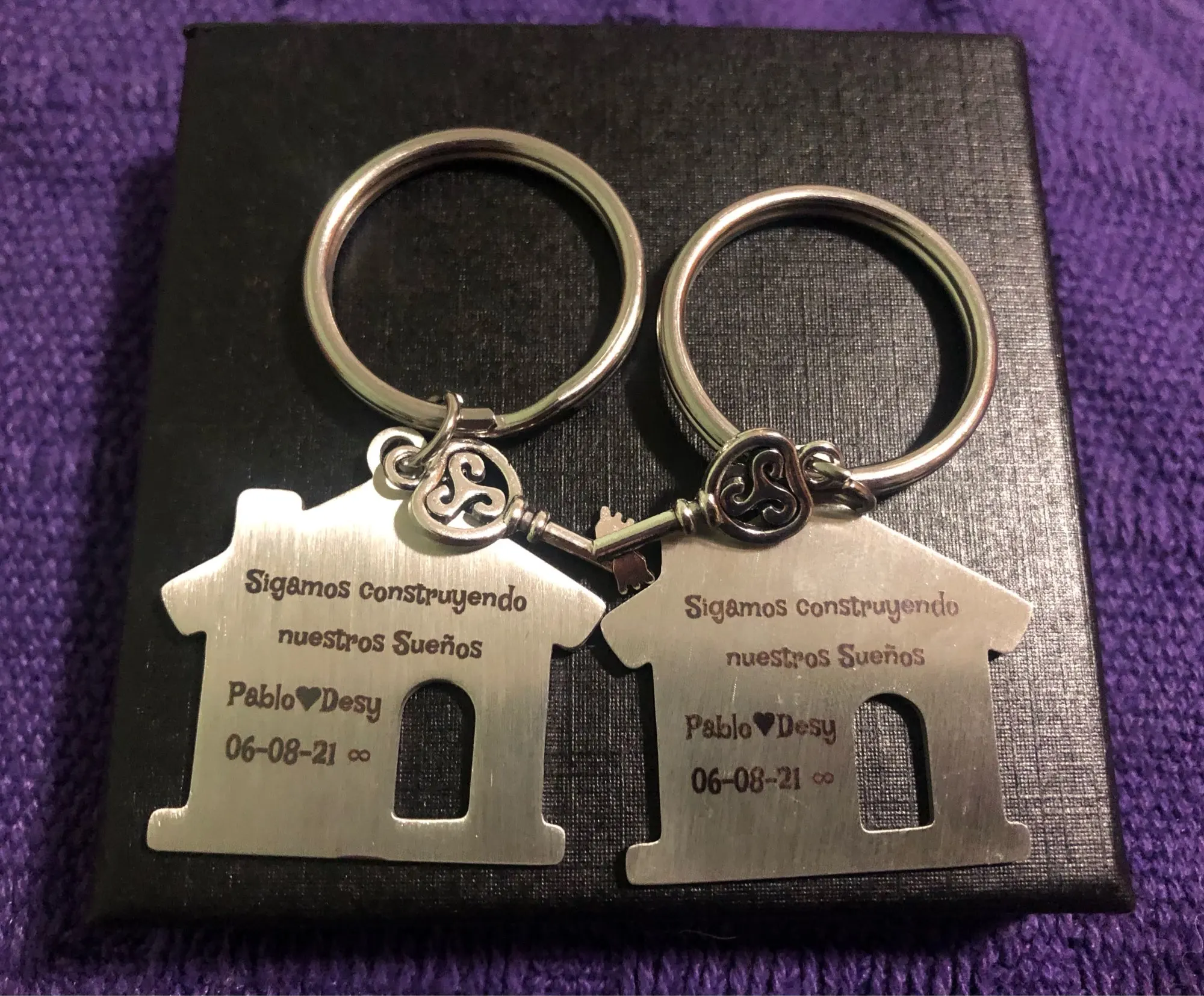 Персонализированный новый домашний брелок: на лицевой стороне дома можно выгравировать 5 линий, 20 символов на линию для первых двух линий и 10 символов на линию для последних трех линий. 12 шрифтов на выбор. (Примечание: Пожалуйста, оставьте сообщение с гравировкой и шрифт при оформлении заказа или свяжитесь с нами напрямую.)