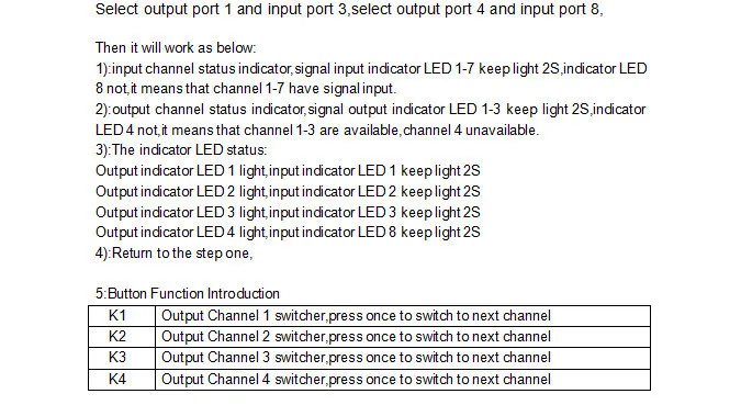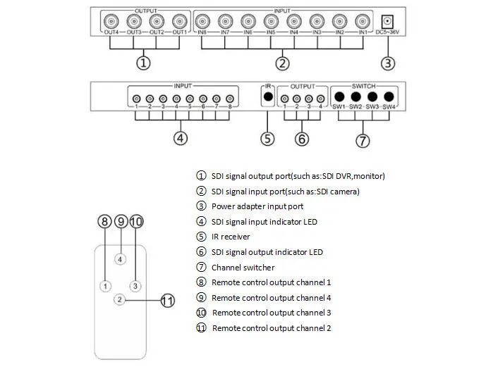 Этот продукт представляет собой матрицу SDI 8 × 4, которая может преобразовывать SDI сигнал из 8 портов в любые другие 4 Независимых выходных порта. Он поддерживает вход и выход сигнала Full-HD SDI, а также очень прост в использовании с высокой стабильностью и надежностью. Он широко используется на всех ТВ-станциях и других рабочих местах, безопасном мониторинге безопасности, месте обучения и т. д.