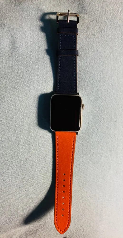 Доехало за дней 10 до Москвы. Нитки все в цвет ремешка. Само крепление сидит хорошо и не люфтит. Металическое и выглядит надежным. Сам ремешок покрашен не очень хорошо. Краска начала стираться через 2 дня (сфотал вблизи). Цвет на картинках гораздо ярче чем в живую. Посмотрим сколько проживет. Заказывал сразу 2 варианта расцветки что бы миксовать.