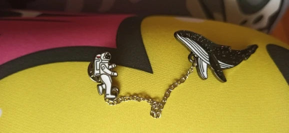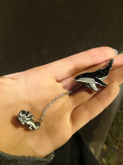 Качество шикарное. Булавка - иголочка с металической заклепкой. Материал - металл. Кит залит чем-то похожим на акрил с редкой блесткой. Пришло супер быстро до Магадана - 1,5 недели.