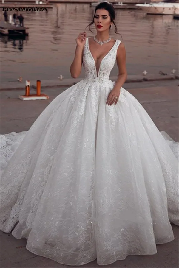 Роскошные кружевные свадебные платья принцессы, новинка 2021, бальное платье с V-образным вырезом и шнуровкой сзади, арабское платье со шлейфом, свадебное платье