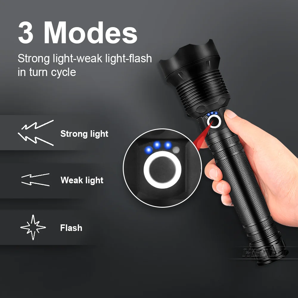Мощный светодиодный фонарик использует CREE XLamp XHP50 led для максимальной выходной мощности до 6000 люмен Увеличьте 1*18650 или 1*26650 аккумуляторный отсек, чтобы увеличить время работы. Дисплей емкости аккумулятора, телескопический зум Микро-usb для компьютера usb, Автомобильный USB, usb-разъем для зарядки, зарядный фонарик Изготовлен из авиационного алюминиевого сплава прочный HAIII военный класс Жесткий анодированный Водонепроницаемый в соответствии с IPX-6, водостойкий, может использоваться в дождливую погоду, но не может положить его в воду Подходит для работы, охоты, альпинизма, рыбалки, кемпинга и активного отдыха и т. д. Ударопрочный до 2 метров
