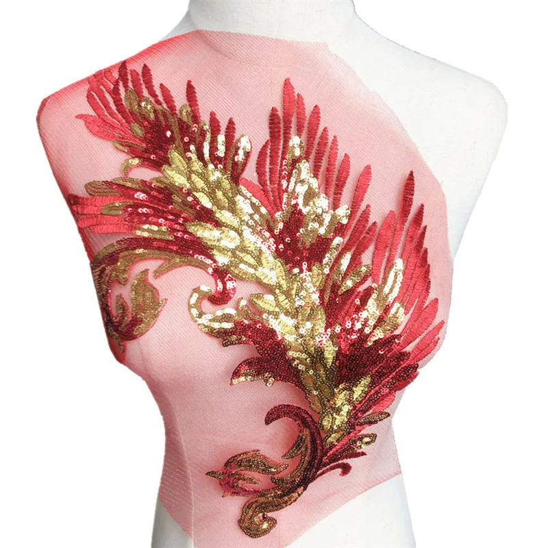 Вышивка с красными блестками и перьями 40 см, нашивка, мечтательная отделка из сетки, кружева, свадебные аппликации, сделай сам, отделка под свадебное платье, джинсы