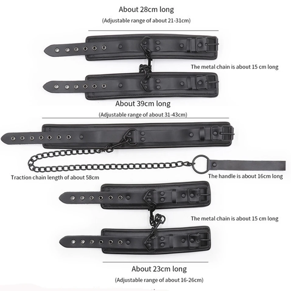 Материал: из искусственной кожи + губка Цвет: черный Размер: регулируемый, один размер подходит всемНаручники: длина около 23 см, ширина 6 см, можно регулировать диапазон 16-26 смМанжеты на лодыжке: длина около 28 см, ширина 6 см, можно регулировать диапазон 21-31 смВоротник: длиной около 39 см, ширина 6,5 см, можно регулировать погоды; Большие размеры 31-43 см для ухода за ребенком для мам Посылка включает в себя: