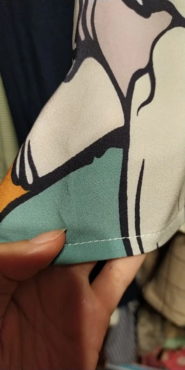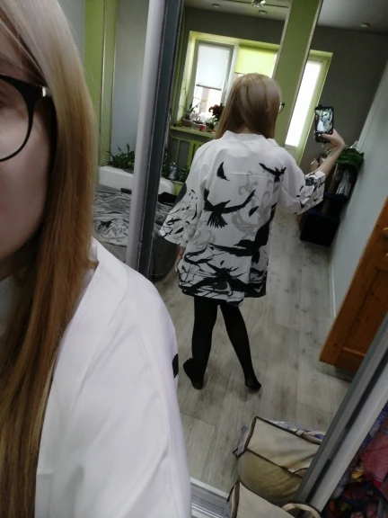 Принт яркий, ткань приятная, видимых повреждений нет, размер подошёл. Не выглядит как халат, можно и на улицу выйти в нем.