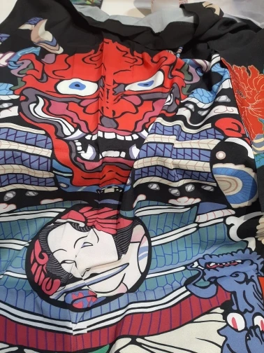 Заказ пришёл очень быстро, меньше чем за месяц, доставлен без повреждений. На ощупь синтетика, но с очень качественно выполненным рисунком и главное ярким. Мне очень понравился рисунок. Никаких торчащих ниток нет, с этим порядок. Взяла размер на свои 103-84-100, кимоно село нормально, взяла бы подлинней - было бы до коленей. С продавцом не общалась. Очень классная вещь, если в 2021 году будет японский фестиваль в мск - пойду в этом кимоно :)