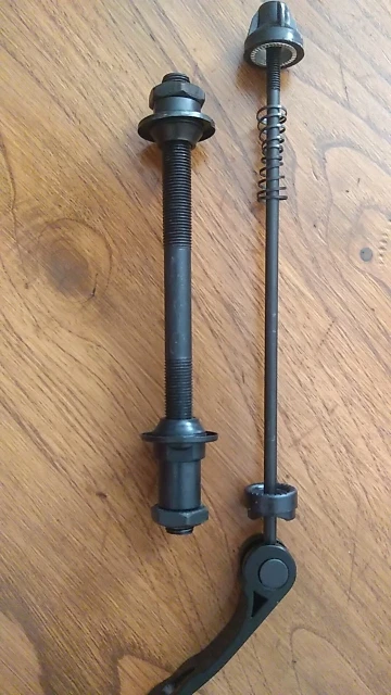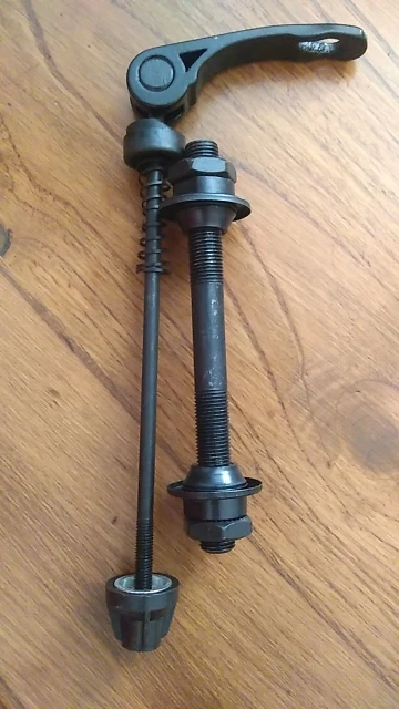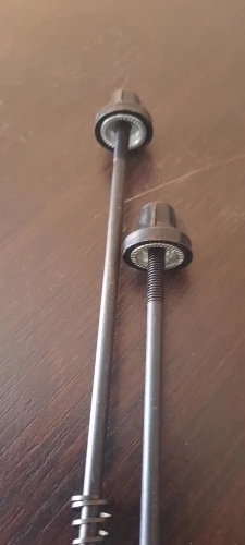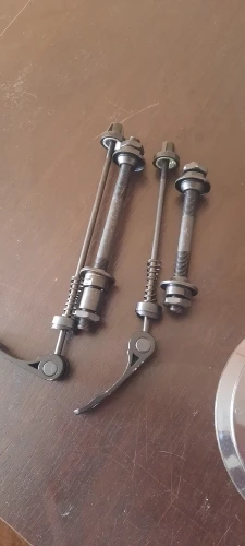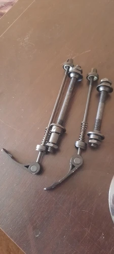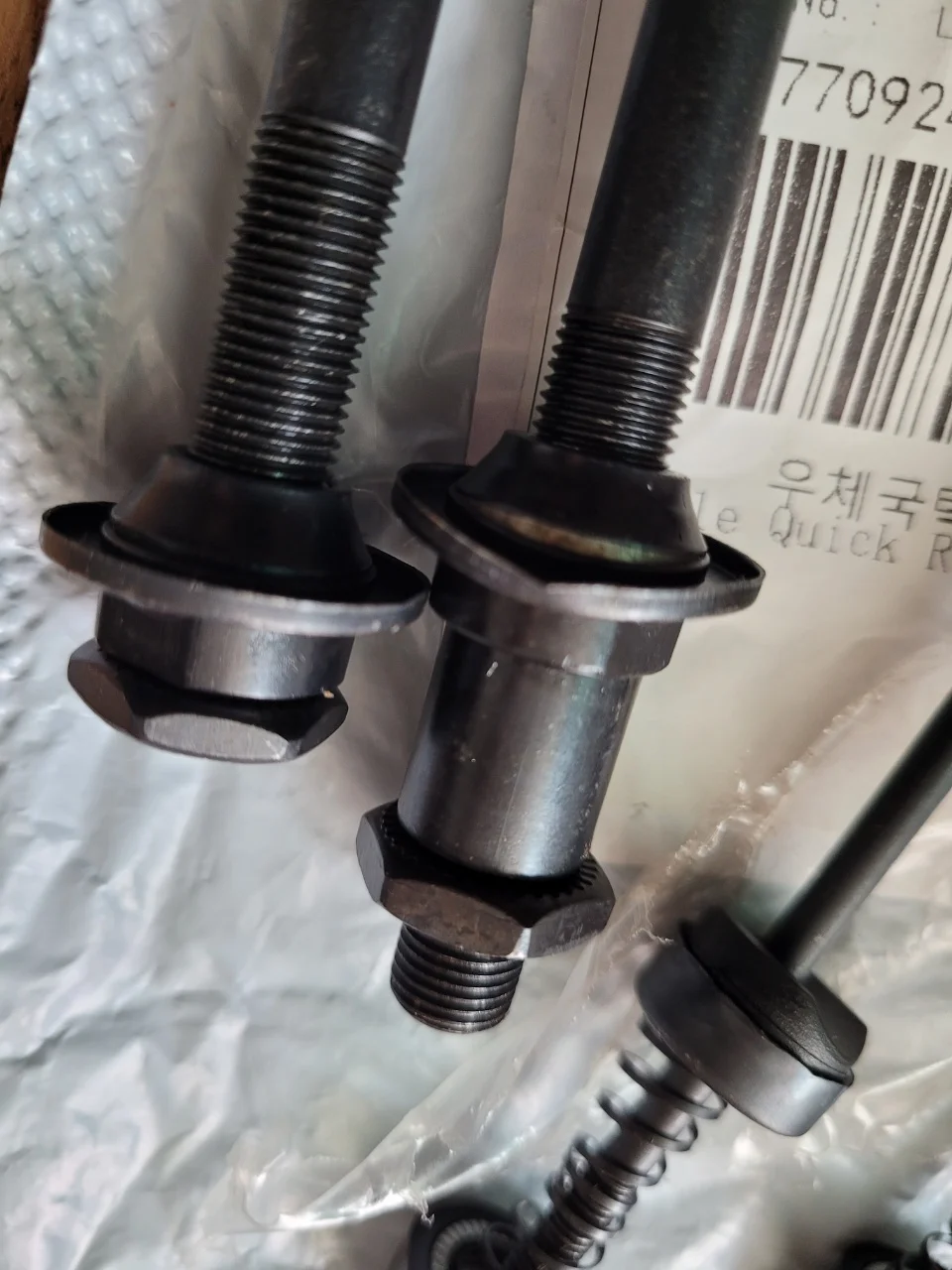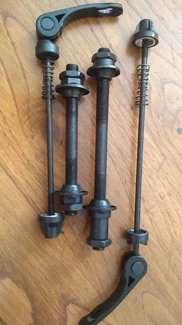 Bujes de liberación rápida. De acero. Han llegado correctamente. Son de una calidad acorde al precio. Vienen completos para rueda delantera y trasera.