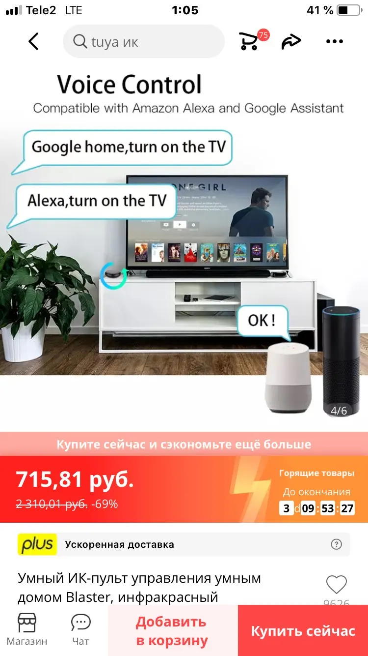 Отличный ИК. Работает с Алисой через смартлайф. Доставка быстрая.