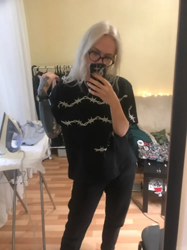 Дошло за 2 недели, пришло почему-то в пункт выдачи ла-моды (???). По качеству - синтетика, хоть и довольно приятная, принт качественный, выглядит дорого. С купоном взяла за 500, щитаю, что нормас цена за футболку с принтом с двух сторон. Одно «НО» рукава почему-то топорщатся фонариком, немного уродует картинку)