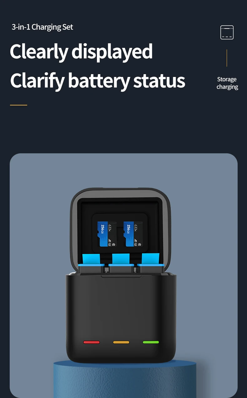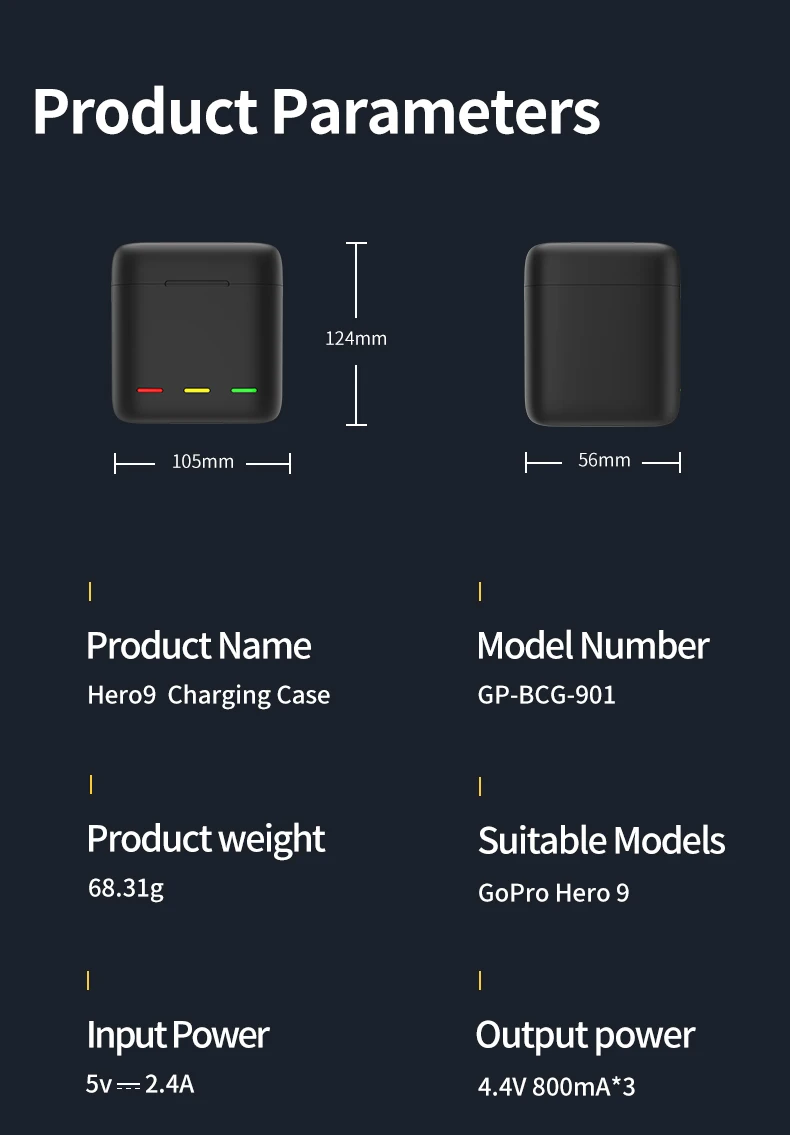 1. Большая емкость 1750 мАч, терка, чем у оригинальной батареи 2. До 112 минут съемки на одном аккумуляторе (время использования разное в разных режимах). 3.100% идеально подходит для GoPro Hero 9 черного цвета, без всплывающих окон. 4. Зарядное устройство от квадрата к кругу обеспечивает более удобный захват, приятный на ощупь, как и детская кожа. 5. Девять защита, используйте с уверенностью, аккумулятор и зарядное устройство в безопасности. 6. Одновременная зарядка и хранение трех батарей, вмещает до двух TF-карт и трех батарей. 7. 2,4 а большой ток, полная зарядка занимает всего 2,5 часа. 8. Силиконовый слот для карт для хранения при лучшей защите. 9. Магнитное открытие и закрытие, крышка с использованием магнита, простая, надежная работа. 10. Противоскользящий силиконовый коврик, обеспечивает большую безопасность при использовании внизу. 11. Интерфейс Type-c, поддержка прямой и обратной вставки, АДАПТЕРНЫЕ кабели не требуются. 12. Четко отображается, уточняет состояние аккумулятора, батарея полная, горит зеленый светильник, близко к полному-желтый светильник горит синим светильник Том, зарядка-красный светильник горит синим светильник том, В режиме ожидания горит синий светильник. 13. Легко помещается в рюкзак, не занимает много места.