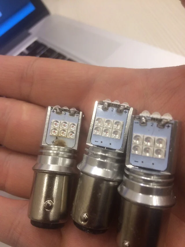 Супер яркие лампы! На ботру есть стабилизатор тока. Потребление при 12В: 1,07Вт(0,09А)/4,91Вт(0,41А). При 14,2В: 1,13Вт(0,08А)/4,82Вт(0,34А). На максимальной яркости за 2 минуты разогревается с 25°С до 60+°С, за 3,5 мин. непрерывной работы уходит в перегрев (92°С.), авторегулировки тока при повышении температуры нет. За 5 минут на откытом воздухе остыла с 92°С до 48°С(в фаре будет раза в 2 дольше). Вообщем вывод такой - либо не держать по долгу педаль тормоза и вообще стараться не использовать её))), либо ставить балластный резистор в разрыв минуса(14...15 Ом 5Вт[это снизит её максимальную мощность до ~3,6...4Вт] и она не сгорит в разы дольше или вообще никогда!) Очень хорошие лампочки, хоть и не без минусов! Буду брать ещё :-)