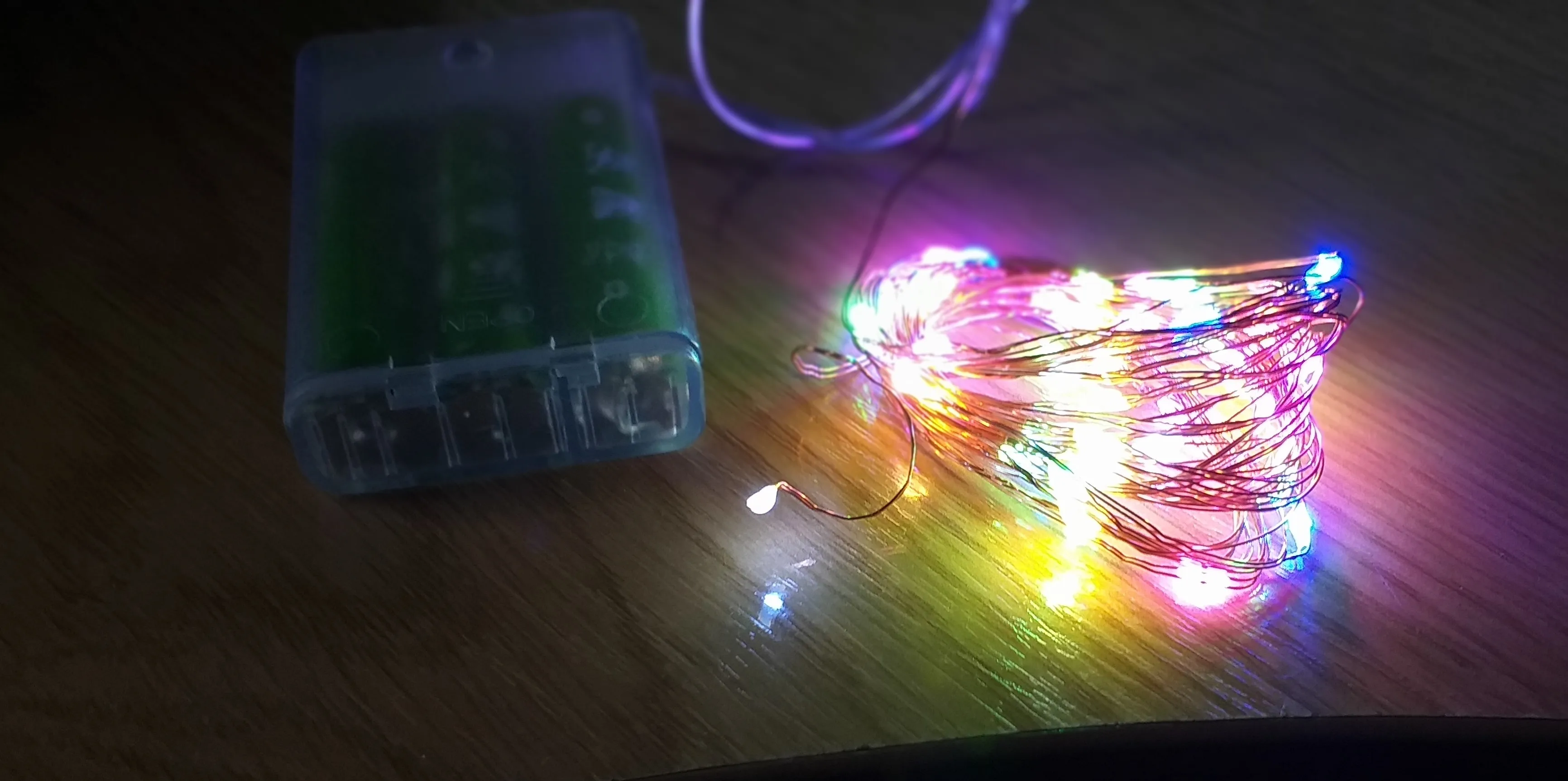 Работает, длинная, цвета приятные (розовый голубой зеленый желтый синий) Лампочки маленькие крепятся на проволоке медной. Не очень яркая