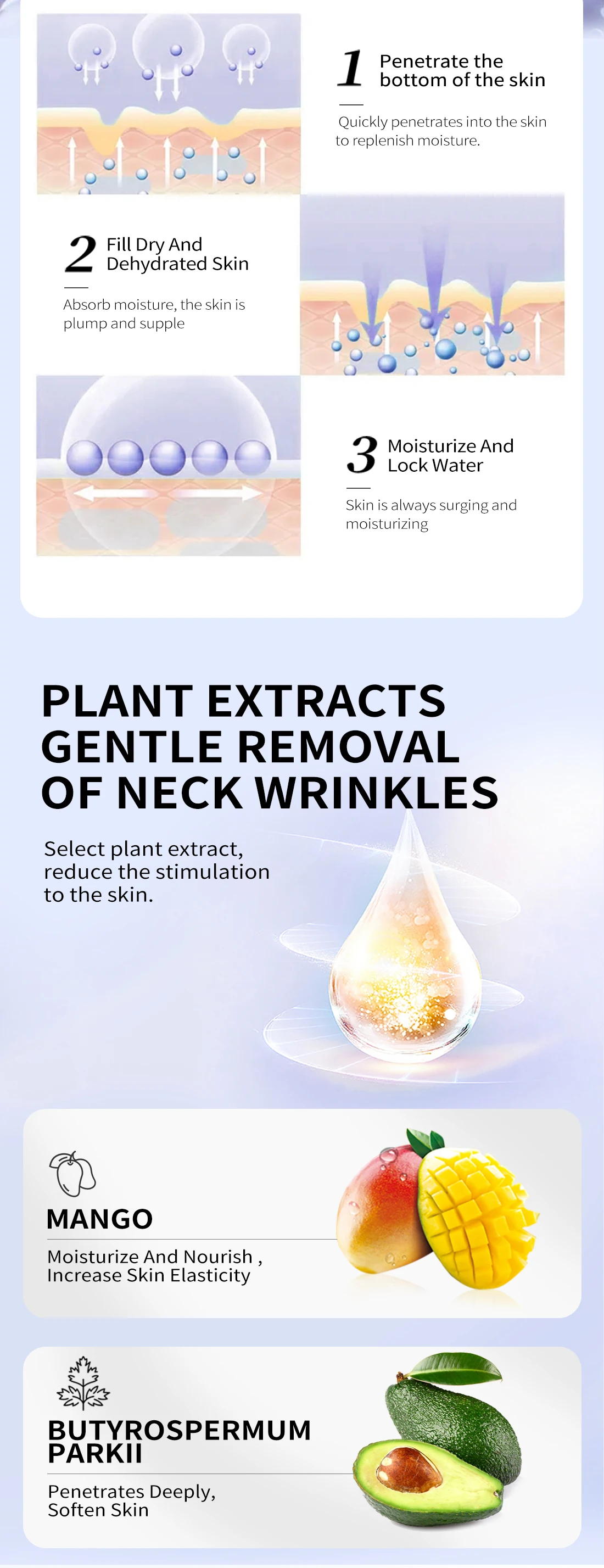 Богатый разнообразными питательными веществами растительной эссенции, Дает коже обильное питание и влагу, помогает оживить дно кожи, восстанавливает морщины, тонкие линии и другие проблемы с кожей, обеспечивает укрепляющие кожу шеи и омолаживающие эффекты, сохраняет здоровье, естественную и молодую кожу.