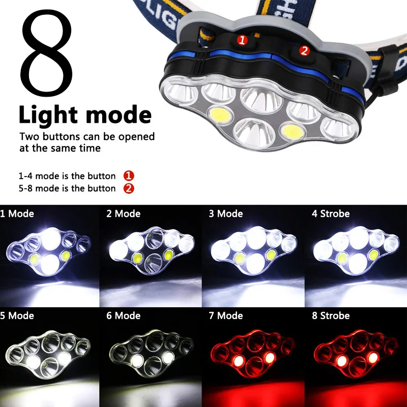 ★Модель лампы: 2 * T6 + 4 * XPE + 2 * COB★Режим: 8 файлов: основной светильник: 2 * T6 яркий --- 4 * XPE яркий --- 2 * T6 + 4 * XPE яркий --- 2 * T6 + 4 * XPE мигающий; COB светильник: 2 * COB блики --- 2COB слабый светильник --- 2 * COB красный яркий --- 2 * COB красный светильник вспышка