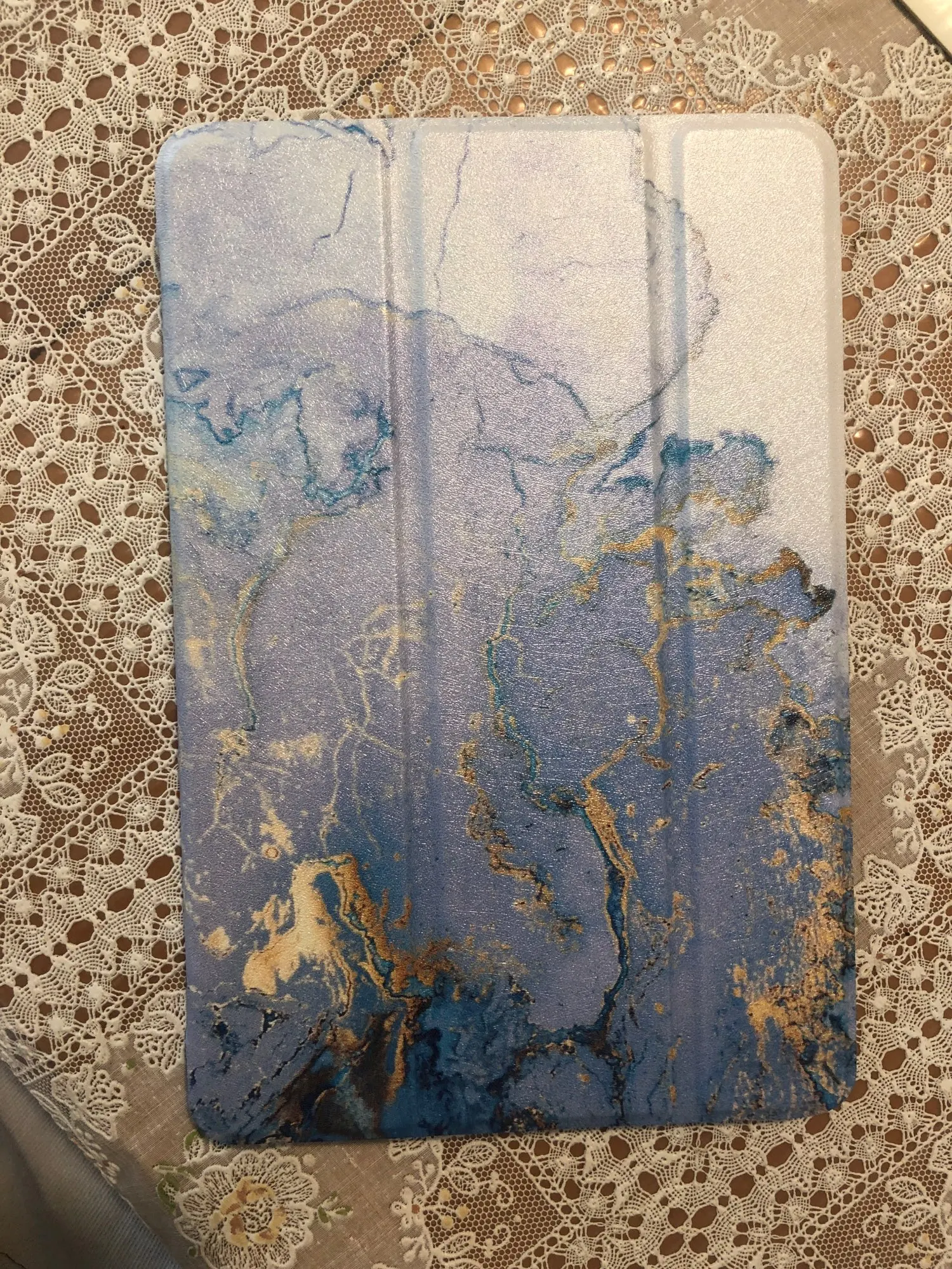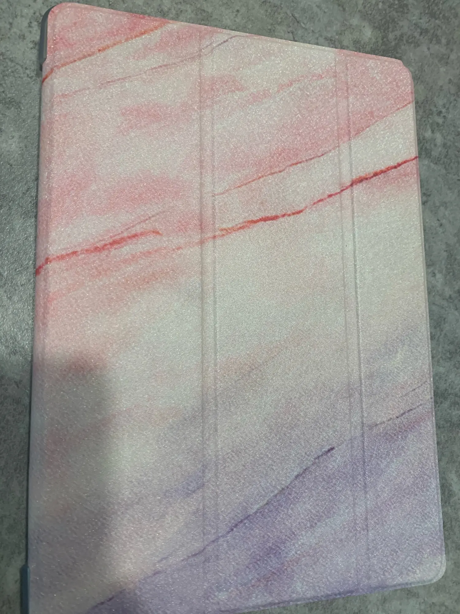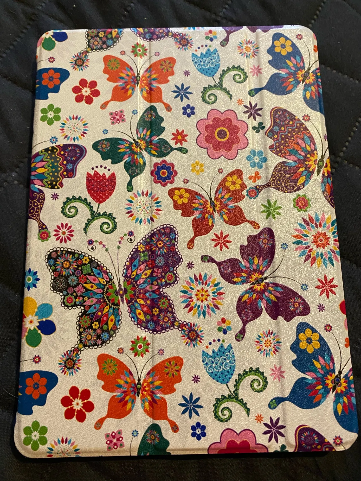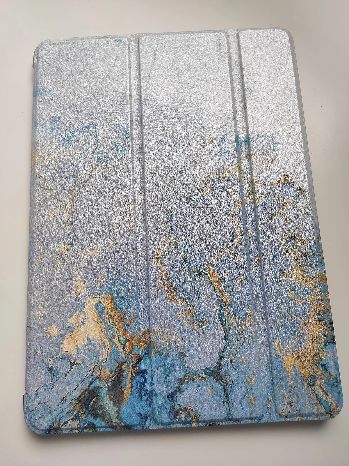 Хороший чехол, достаточно плотный, крышка хорошо сворачивается, чтобы можно было поставить планшет. Магнит работает, планшет блокируется. Качественная фактура, насыщенные цвета. Единственное, думала, что золотые полоски будут выделяться золотым блеском и рельефом, но это просто как напечатанная картинка.