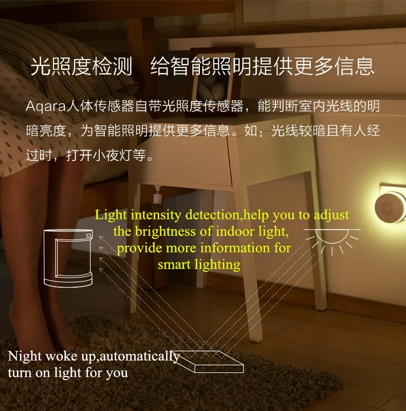 Этот товар должен использоваться с многофункциональным шлюзом.Если продукт подключен к HomeKit, функция обнаружения светильник не поддерживается.