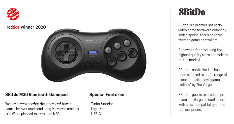 Package8BitDo M30 Bluetooth gamepad, Instruction Manual, USB-C cable