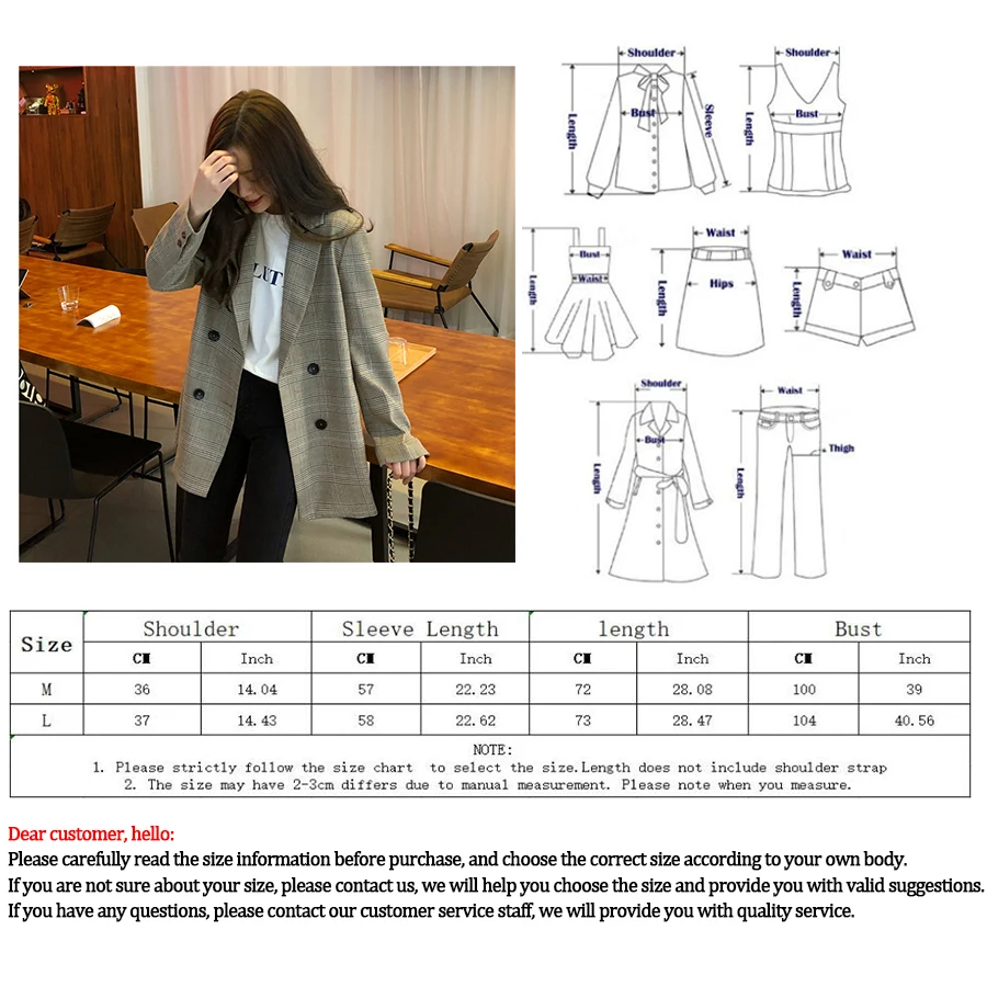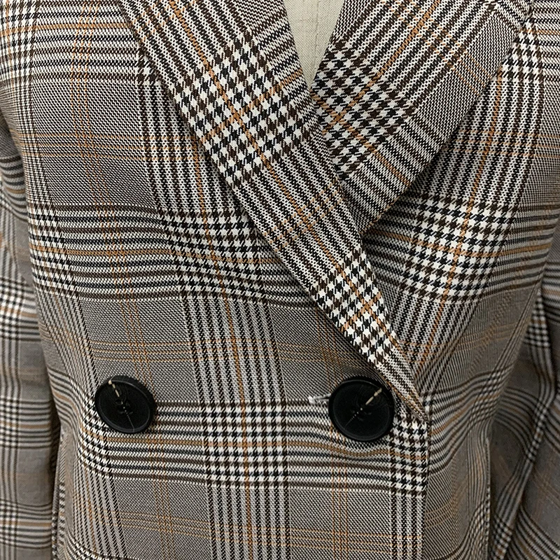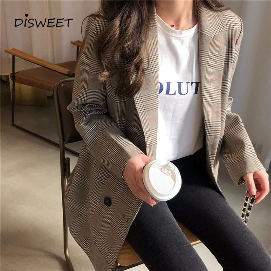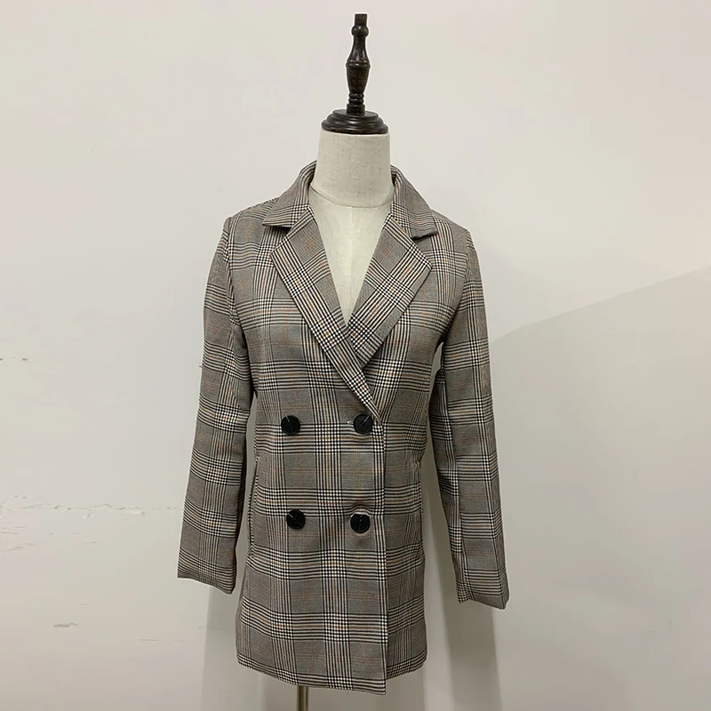 Женский офисный пиджак в клетку, свободные топы, двубортная куртка, Женский Повседневный костюм с карманами, пальто, 2019