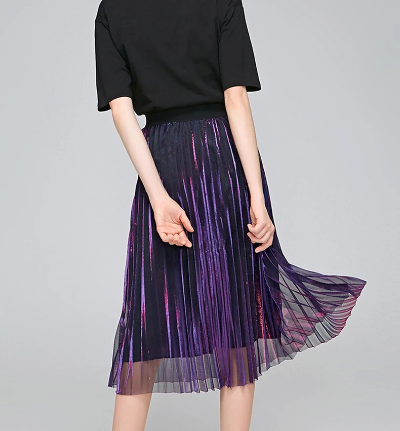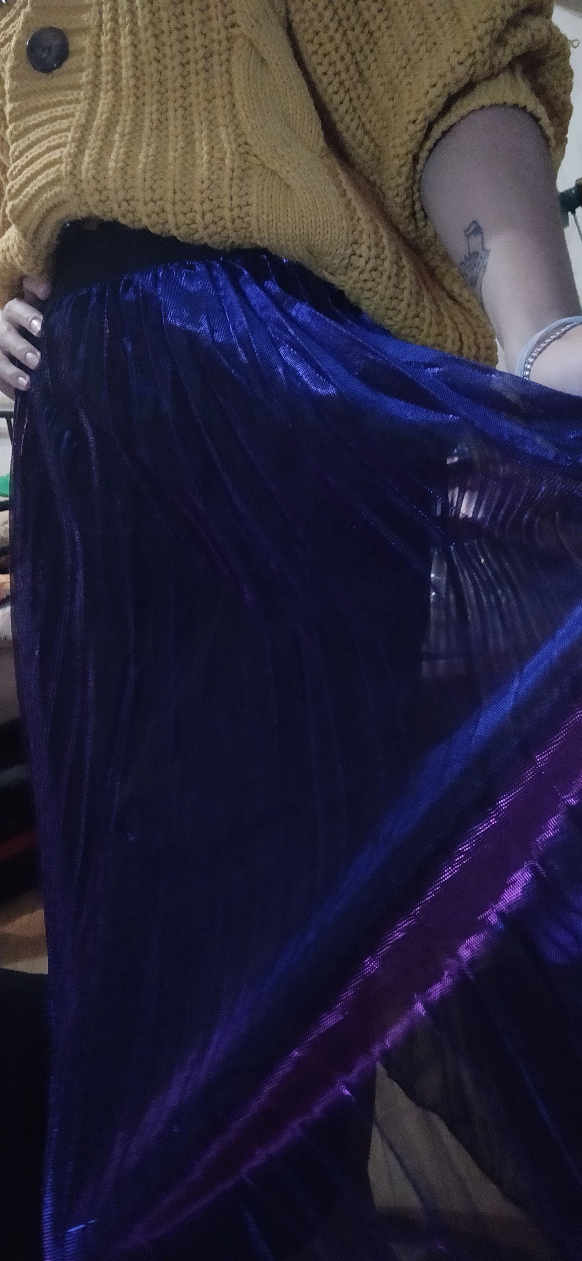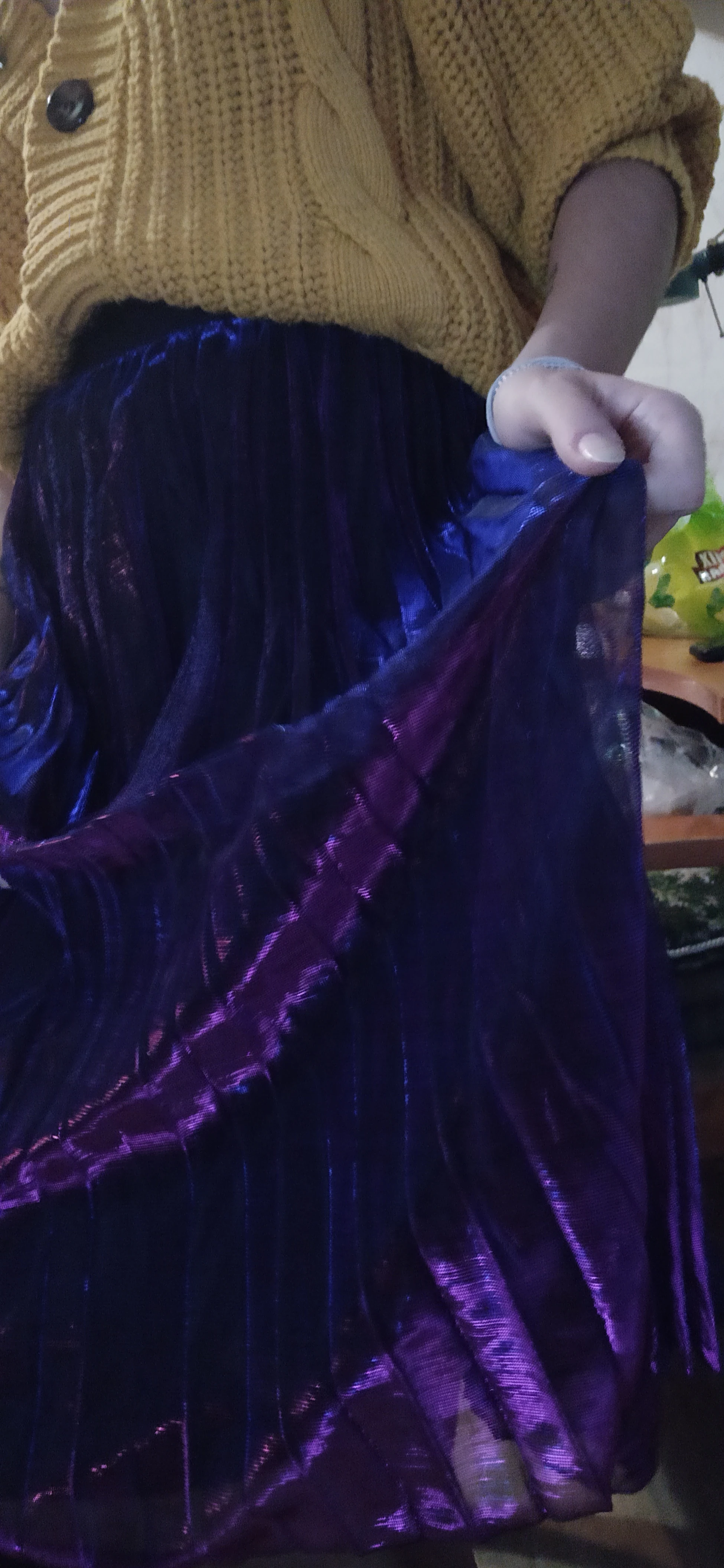 Юбка выглядит классно, пошита хорошо, перелив правда больше сине-малиновый, фиолетовый больше виден только на изнанке. Дошло очень быстро, где-то 2 недели