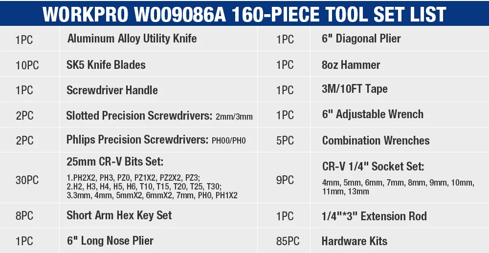 Набор инструментов для дома WORKPRO 160, набор инструментов для дома шт.