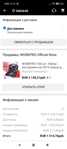 Доставка в СПб за неделю. Курьер IML принёс на работу. Упаковка не повреждена. Очень компактный набор. Брала в подарок мальчику 8 лет (очень любит мастерить с папой). Теперь есть настоящий, а не игрушечный инструмент. Ребёнок счастлив. Подарок получился за 1515 рублей. С продавцом не общалась.