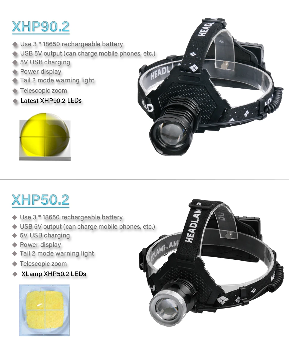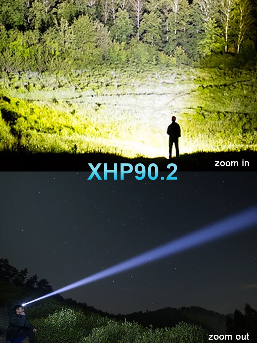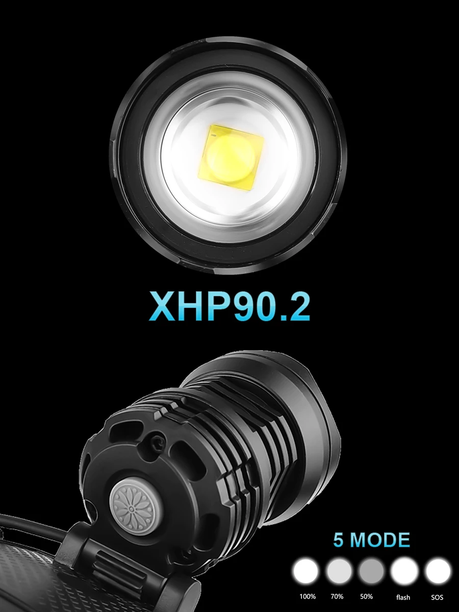 Мощный светодиодный головной фонарь использует новейший светодиодный источник света xhp90.2 с максимальной яркостью 350000 люмен и радиусом облучения 1000 метров