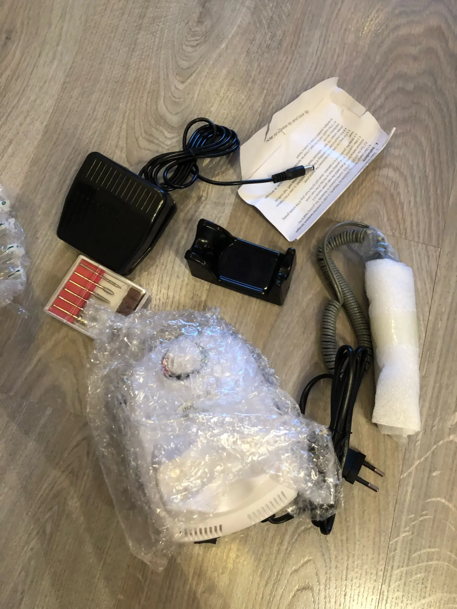 Получила посылку через неделю курьером на дом. В полном восторге, машинка мощная, отличная скорость, качество фрез понравилось, но конусная фреза показалась островата. В целом очень довольна!!! Аппарат управляется педалью, есть разные скоростные режимы, а так же вращение по часовой стрелке и против. Сам аппарат лёгкий, немного коротковаты кабели, но в целом не критичны Упаковано было качественно, без коробки, но в пупырку и дутый плотный каркас Замечательный аппарат, за свои деньги просто чудо!!! Однозначно рекомендую Все выглядит как в описании