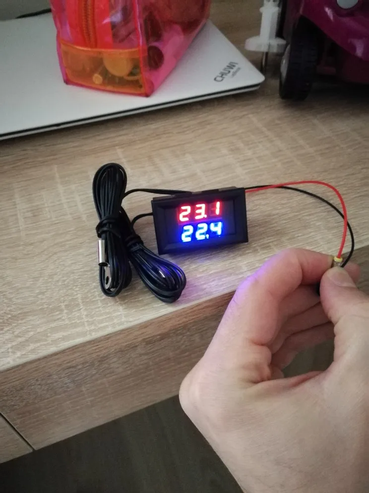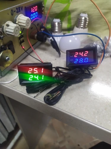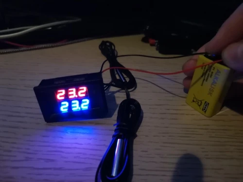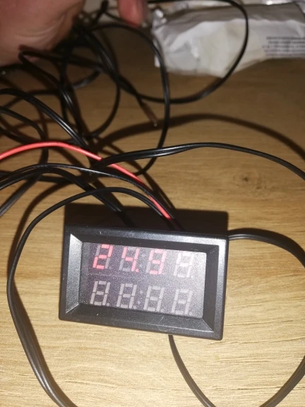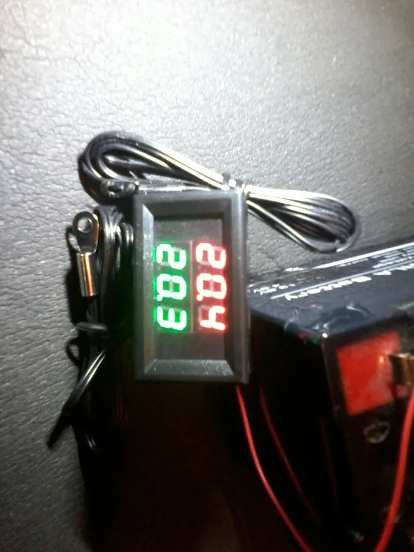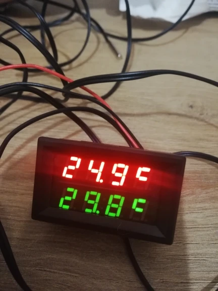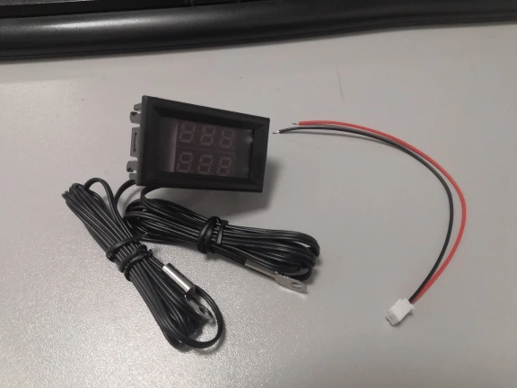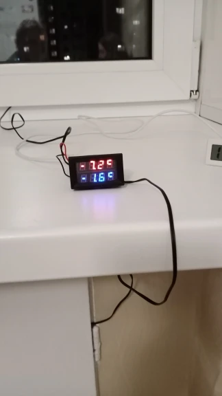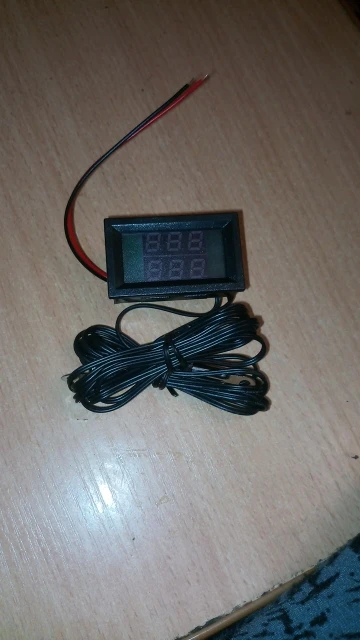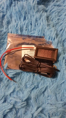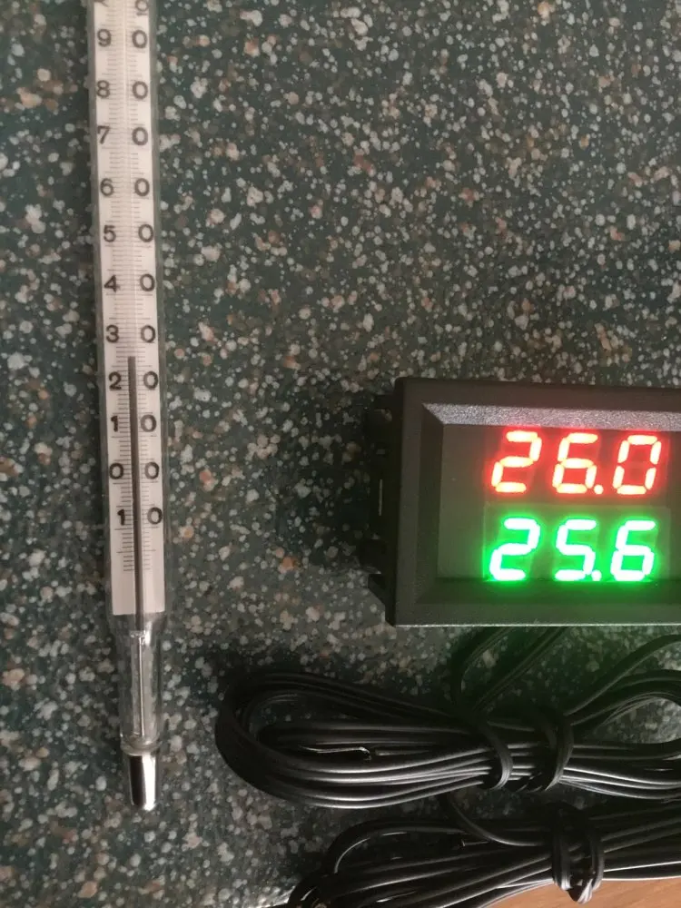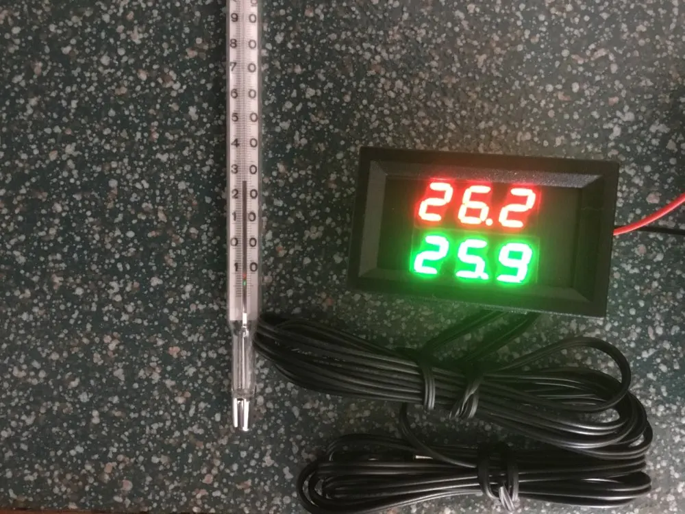 Товар прибыл в порядке. Работает в аккумуляторе 12 В. Показания между двумя датчиками немного отличаются друг от друга. На картинке, он был сравним с точным немецким ртутным термометром, для таких денег нормально. Время реакции быстрое, 1 сек. В ручную температуру