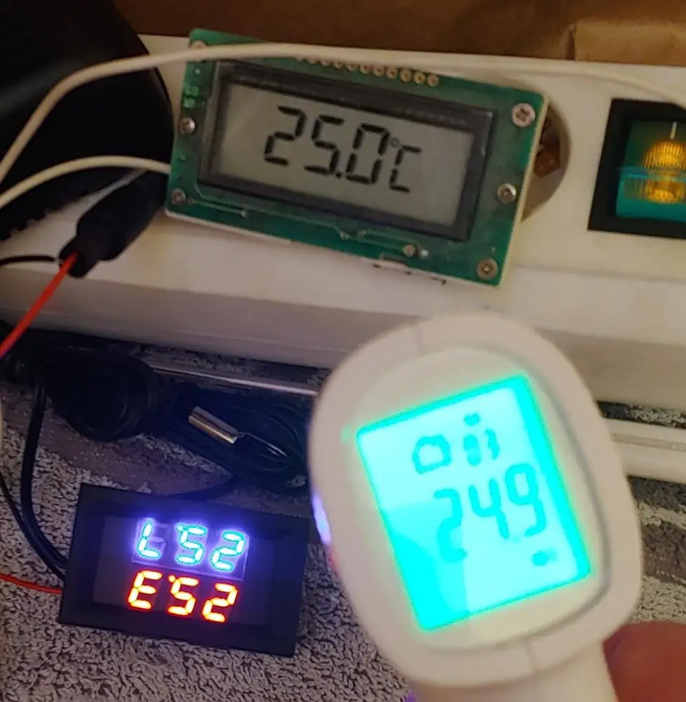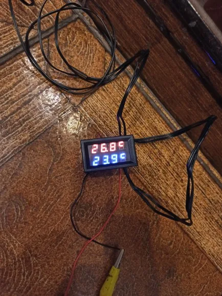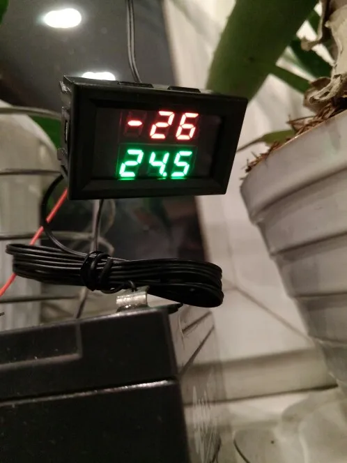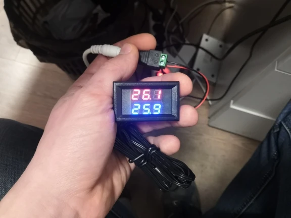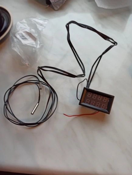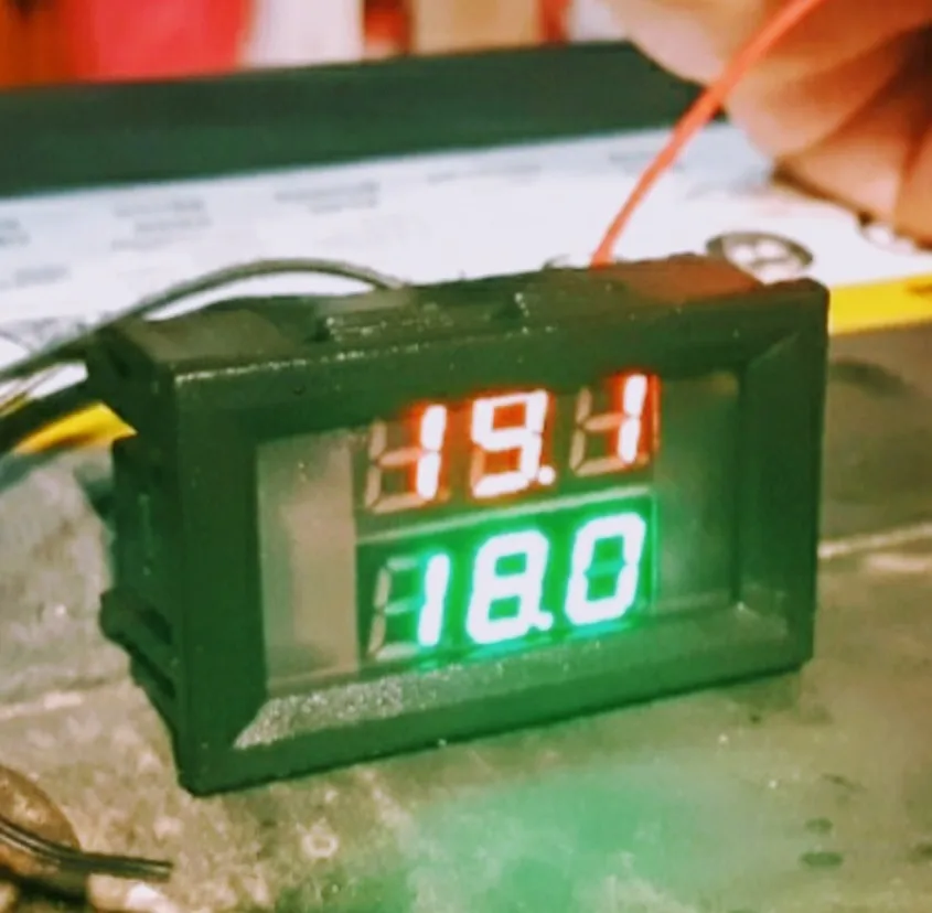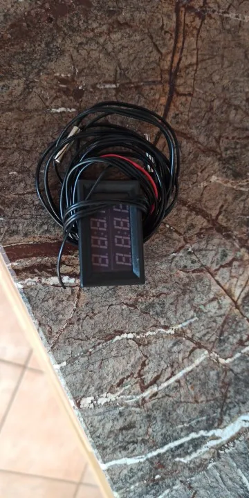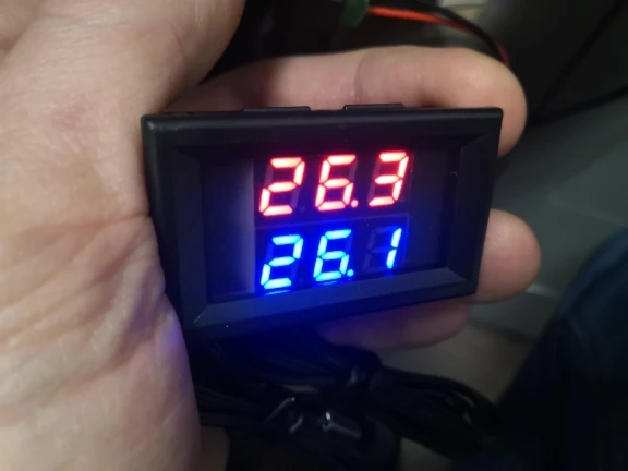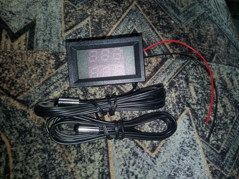 Товар прибыл в порядке. Работает в аккумуляторе 12 В. Показания между двумя датчиками немного отличаются друг от друга. На картинке, он был сравним с точным немецким ртутным термометром, для таких денег нормально. Время реакции быстрое, 1 сек. В ручную температуру