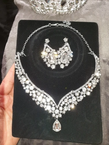 Нечему завидовать коронам, которые продают в магазинах невесты. У него есть блеск, который выглядит как бриллианты, и он элегантный и очень хорошо прикреплен. Ожерелье и серьги привлекают внимание к дизайну и элегантности. Стоит покупать у этого продавца и сэкономить много денег. Я особенно взял больше сережек и ожерелий, потому что они красивые и в Испании они очень дорогие. Нечего завидовать тем из Suaroski