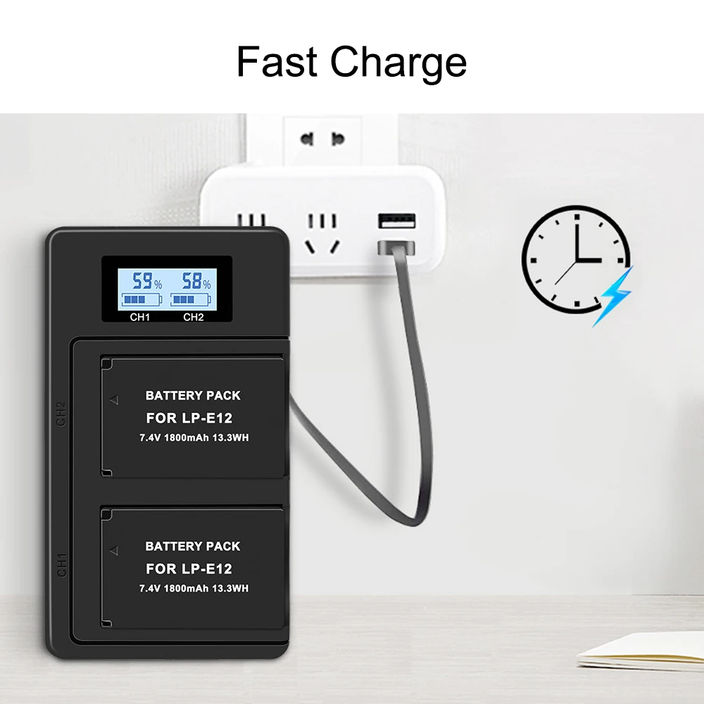 2 шт. 1800 мАч, LP-E12 LP E12 LPE12 Li-Ion Батарея + ЖК-дисплей USB...
