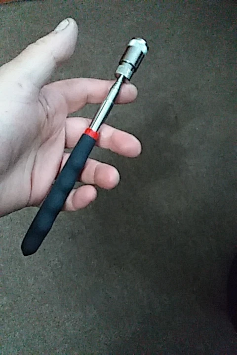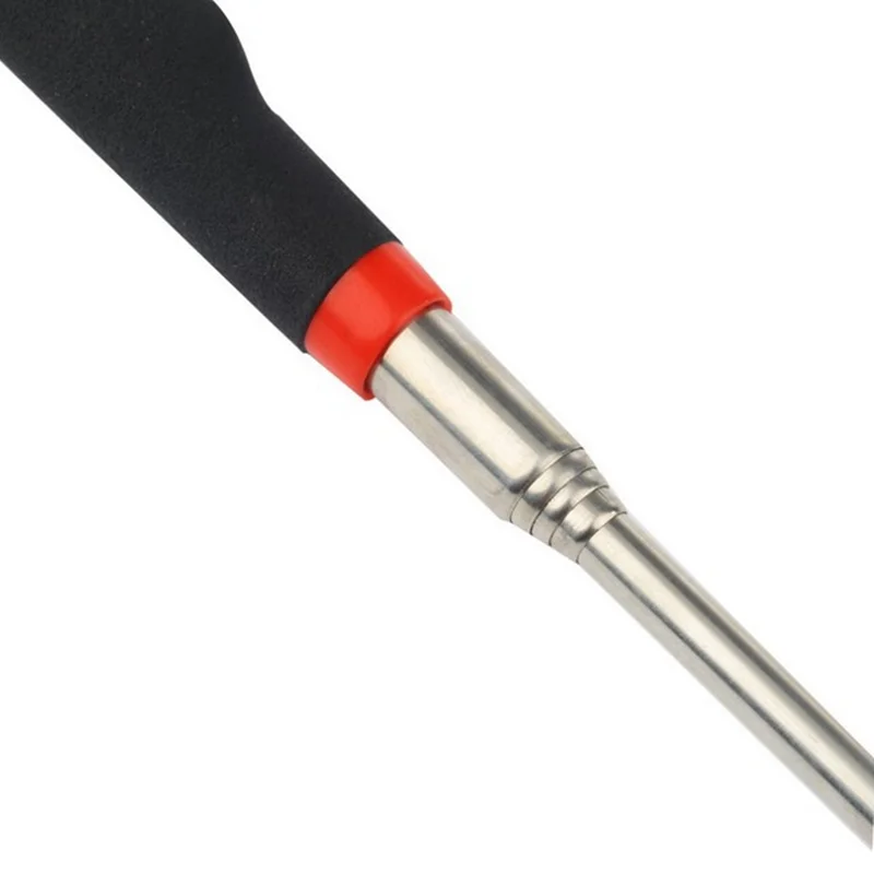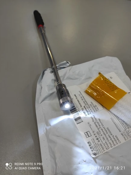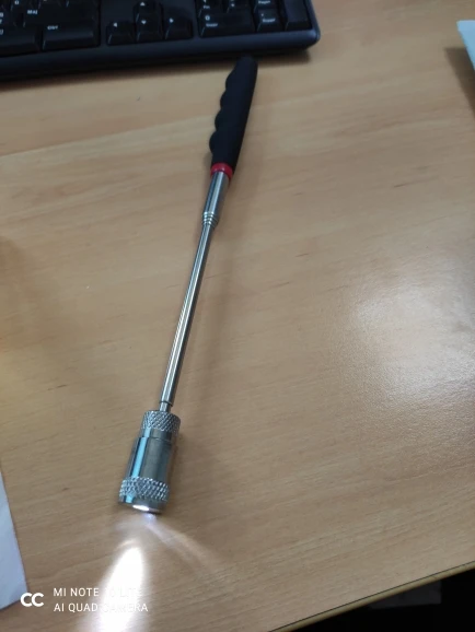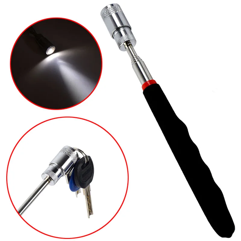 Хорошая и полезная вещь в быту. На конце телескопической палочки магнит и фонарик на светодиоде.