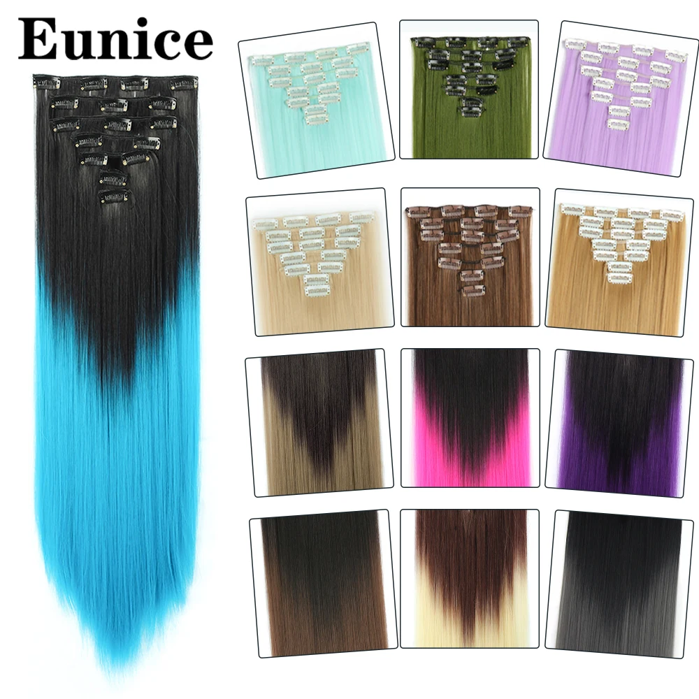 Накладные пряди из синтетических волос, 22 дюйма, 7 шт.компл., на 16 заколках, термостойкие, черные и серые, с эффектом омбре