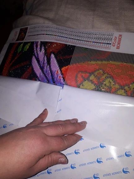 Картина пришла достаточно быстро) упакована хорошо) никаких заломов на холсте не было. Все необходимое в комплекте было, очень круто что все камешки в зип пакетиках, это значительно упрощает их использование и хранение. Камешков хватило и даже очень много осталось) изображение качественное, липкий слой отличный) Рисунок получился безумно ярким и красивым)))) данного продавца рекомендую!