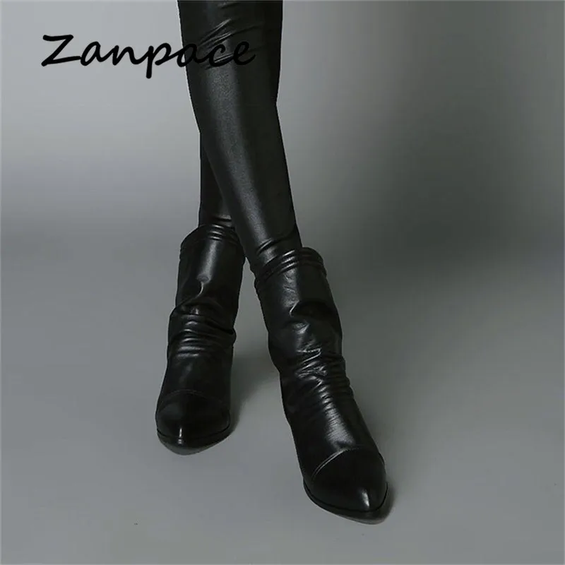 Женские кожаные ботинки, Черные ботильоны на молнии, на высоком каблуке, большой размер 43, для осени и зимы, 2020