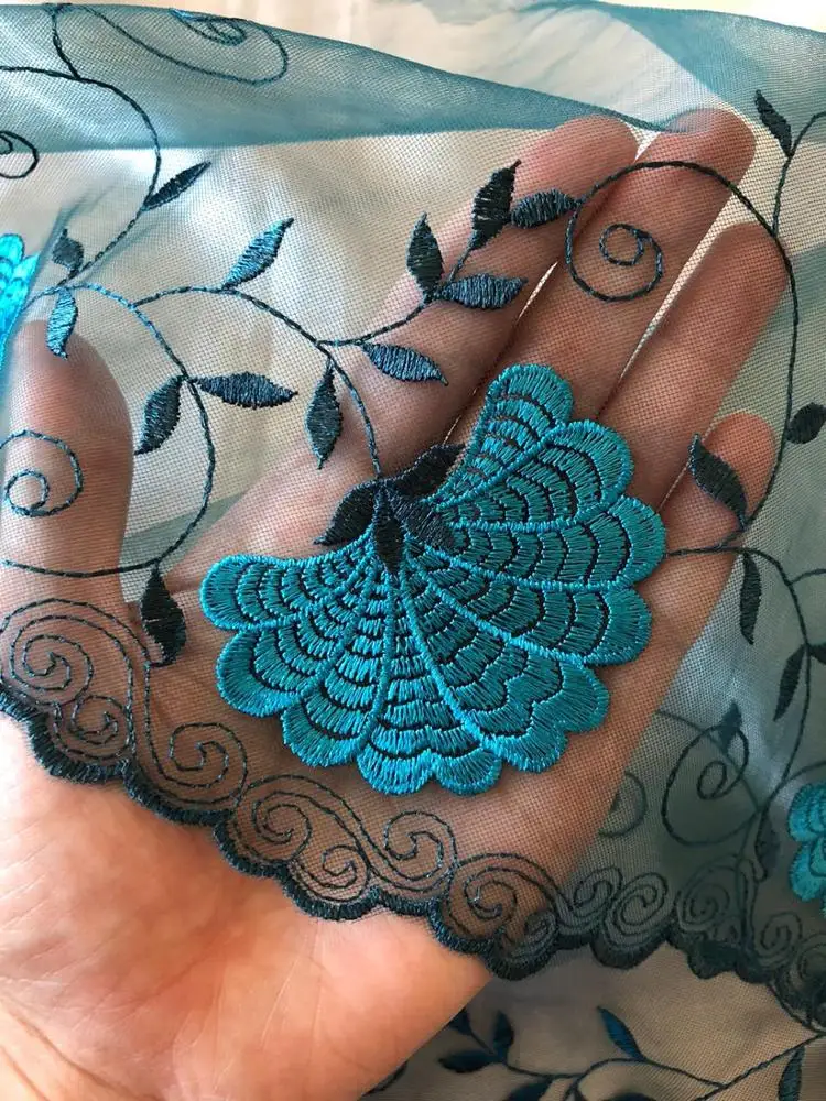 Кружево очень красивое, ярко голубые цветы на темно-зеленом (бутылочном) фоне! Я очень люблю покупать в этом магазине, всегда все на высоком уровне! Товар отличного качества, высылает очень быстро и быстро доставляется. И на этот раз прислали больше, чем заказывала и еще отрез кружева в подарок! Вообщем, 10 звезд продавцу! Буду еще заказывать и всем советую!