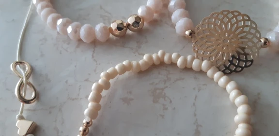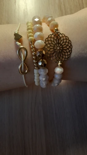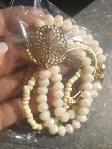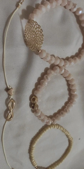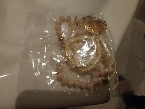 Браслеты для детей. Заказывала из-за самого тонкого из бусин. Но он как раз выглядит очень дёшево, ещё на резинке узел видать. С крупными бусинами- розового цвета, мелкий - бежевый. Пришло в объединённой посылке за 12 дней до Самары
