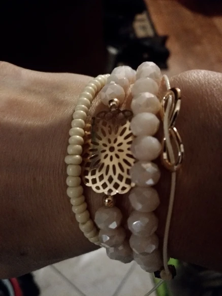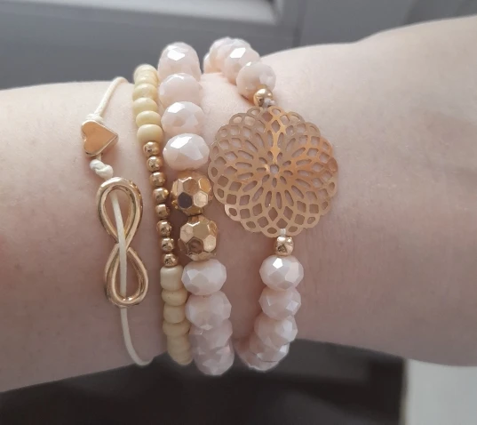Цвет бусин красивый, у меня очень маленькие руки, но три браслета из 4х подошли. Тот, что со знаком бесконечности большеват, он с меня свалился, имейте в виду