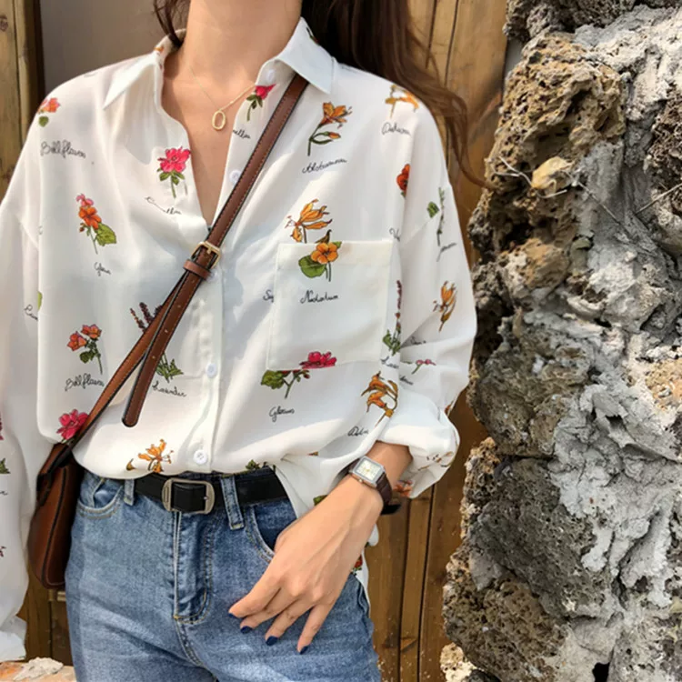 Свободные Винтаж рубашка с цветами в стиле панк Туника Для женщин рубашки Kawaii студент Ulzzang леди Ulzzang Harajuku Ins Топ для Для женщин Ins Chic