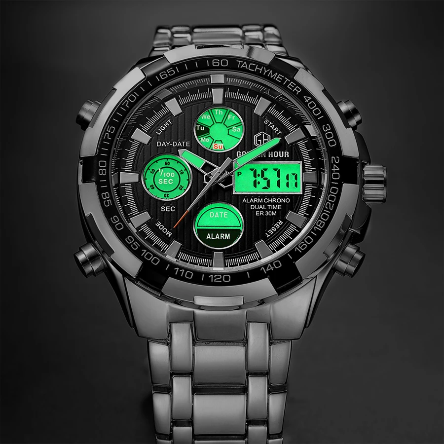100% новые и высококачественные Отображение дня, даты и времени Рождество каждый час Хронограф с круговым механизмом и 1/100 Двухъядерный процессор Аналоговый и цифровой дисплей Браслет из нержавеющей стали Reistant воды