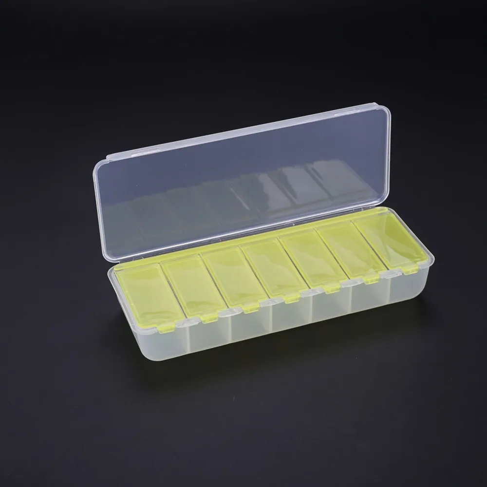 1. 14 сеток ежедневно, еженедельная коробка для хранения таблеток. 2. Можно использовать для хранения таблеток, ювелирных изделий или мелких предметов. 3. Он также идеально подходит для хранения безделушек или предметов, таких как серьги, бусы, кончики для дизайна ногтей и многое другое. 4. 2 линии, каждая линия колеблется от понедельника до воскресенья.
